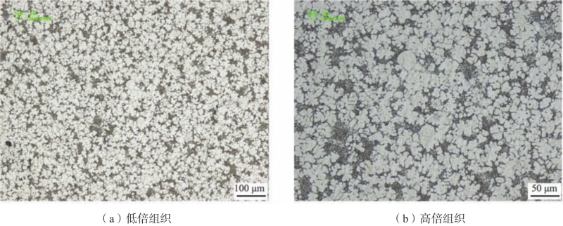圖8 X射線探傷結果 力學性能:半固態壓鑄A319鋁合金材料(本體取樣)抗拉強度370 MPa、屈服強度323 MPa、伸長率4.6%,硬度HB128。 微觀組織:從圖9中可以看出半固態壓鑄支臂(本體取樣)微觀組織中α-Al初晶組織不是常見的樹枝晶而是退化枝晶,似一朵朵花瓣狀(圖9)。