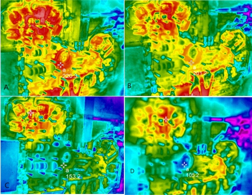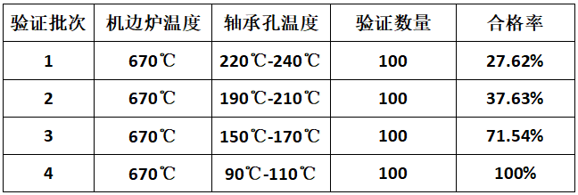 圖三 調整軸承孔區域溫度 A:標定220.3℃;B:標定201.2℃;C:標定153.2℃;D:標定105.2℃ 每次溫度調整后,采用熱成像儀測量確認,在達到需求溫度情況下各生產100件,同步探傷確認軸承孔區域缺陷變化,分別進行加工驗證,并在合格品中隨機抽取進行剖切,確認缺陷離加工面深度,見“表一”與“圖四”,“圖五”。