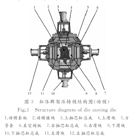 圖2 缸體群架U型澆道 模具結構見圖3,由動靜模鑲塊和4個滑塊及靜模斜抽芯組成,此模具屬于大型壓鑄模,為防止模具在生產(chǎn)過程中因熱膨脹影響正常的導向精度,采用方導柱、導套結構,布置在模具四角?;瑝K抽芯采用液壓缸抽芯,模具設計簡單、穩(wěn)定、可靠。