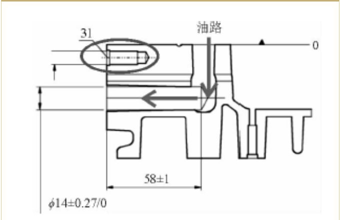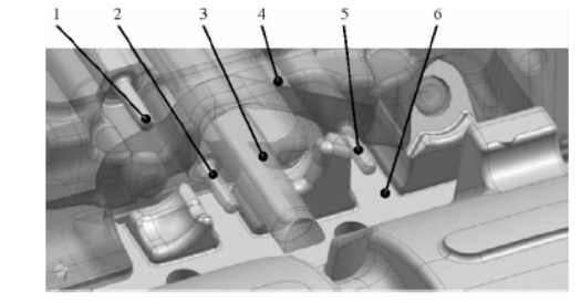圖3缸體群架壓鑄模結構圖(動模) 2.批量生產(chǎn)中的問題及原因分析 生產(chǎn)過程中,鑄件經(jīng)加工后密封測試,發(fā)現(xiàn)在機濾安裝面M6螺紋孔出現(xiàn)微泄露,泄漏位置見圖4,廢品率達8.3%。對泄漏零件進行X光檢驗,發(fā)現(xiàn)鑄件內部有縮孔和縮松。對缺陷部位進行剖切,發(fā)現(xiàn)毛坯孔壁有過熱粘料。泄漏產(chǎn)生的原因是內部存在縮孔和縮松,機加工后內部細小縮孔將油道孔與螺栓孔貫通,導致油道在加壓到0.3 MPa時泄漏量大于10 mL/min。