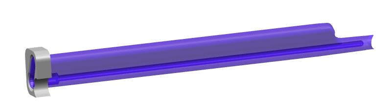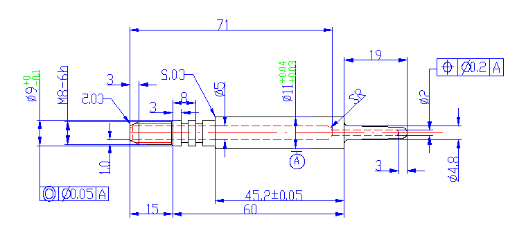圖6 左滑塊異型鑲件 小細型芯加設冷卻水,對型芯進行強制冷卻。型芯采用螺紋與后端的型芯噴管總成連接,采用耐高溫O型密封圈進行密封,可以實現(xiàn)不拆模具進行快速更換。型芯前端用電火花打孔機打直徑Φ2 mm的水道孔。型芯采用噴管式獨立水冷卻,內置不銹鋼噴管Φ1.2 mm,內孔進水,外壁回水。結構圖見圖7。