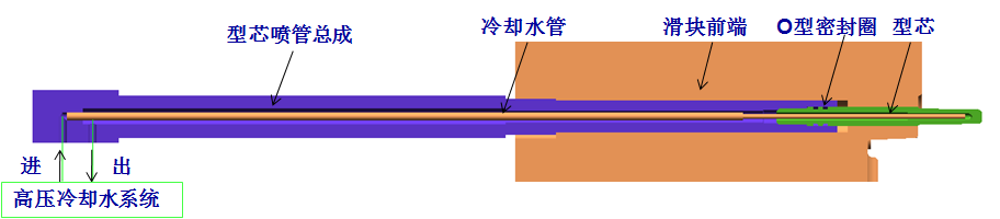 圖5 左滑塊優(yōu)化方案結構圖 異型部位采用鑲件結構,內部加設Φ7 mm冷卻水道。采用噴管式獨立水冷卻,內置不銹鋼噴管Φ4 mm,內孔進水,外壁回水,見圖6。