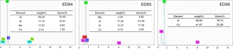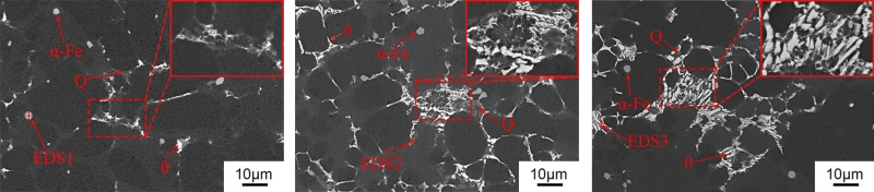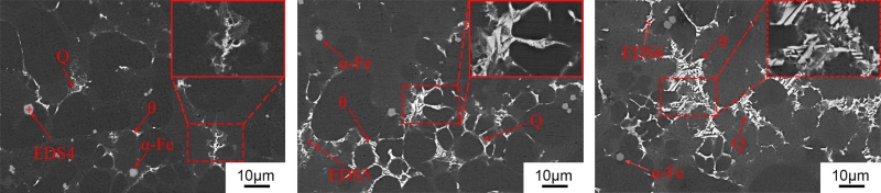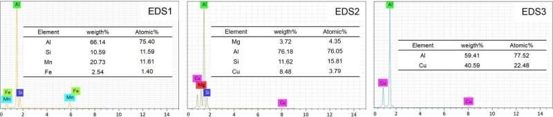(a)1號 (b)2號 (c)3號 可以看出,3組合金的鑄態組織主要由α-Al及Al-Si共晶相組成。其中α-Al晶粒有兩種類型,分別標記為α1-Al和α2-Al。這是因為壓鑄凝固過程是一個兩階段過程,當熔化后的鋁液倒入壓室,壓室內相對較低的溫度能夠將鋁液冷卻至液相線溫度以下,此時α1-Al晶粒在壓室中開始形核并生長,因此也被稱為壓室預結晶。這些晶粒伴隨著未凝固鋁液一同進入模具型腔,因為有充足時間長大,造成最終尺寸較粗大。在模具型腔填充過程中,由于冷卻速率非常快,因此形成了更細小、形狀也更為圓整的α2-Al晶粒。經Sr元素變質后的共晶Si呈纖維狀,同時在共晶區存在呈現出多邊形的富Fe相,通過EDS能譜分析確認其為α-Fe相。