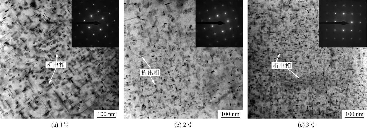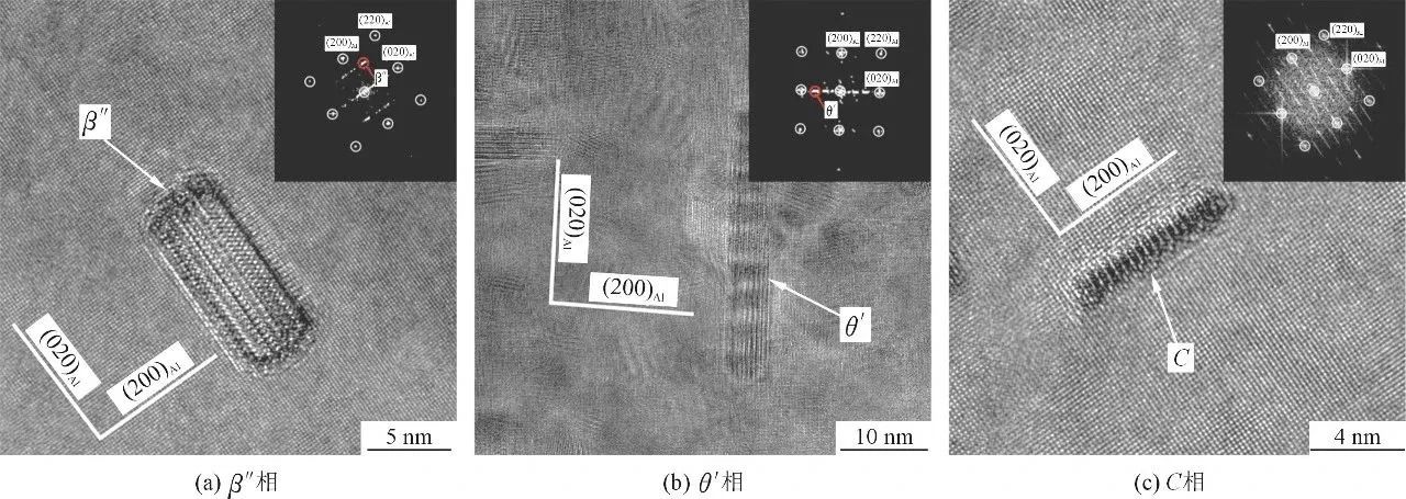 表4 高真空壓鑄Al-10Si-0.5Mn-0.4Mg-xCu合金T5態析出相統計結果 結論 (1)AlSi10CuMgMn合金的鑄態組織均由α-Al、共晶Si和α-Fe、Q和θ相組成。隨著Cu含量增加,Q相數量基本保持不變,形貌以層片狀為主;θ相數量則逐漸增多,形貌由分散的粒狀轉變成聚集的塊狀。 (2)T5熱處理對鑄態α-Al、共晶Si、α-Fe、Q和θ相的影響很小。峰值時效主要納米析出相為β″和θ′相,Cu含量較低時,析出相以β″為主;Cu含量較高時,析出相以θ′為主。