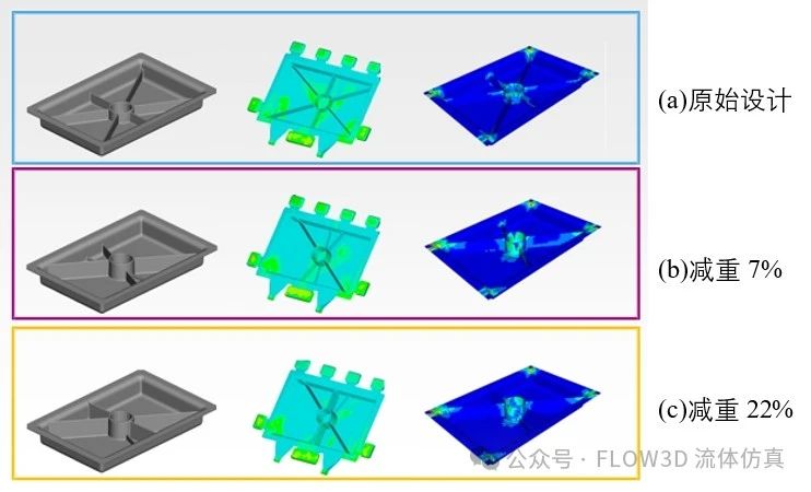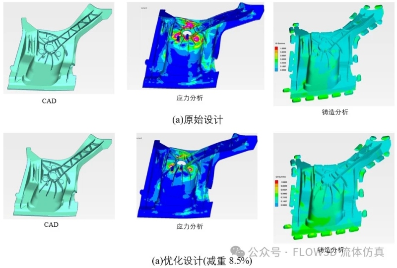 圖9 基礎(chǔ)模型不同減重比率的分析結(jié)果 依據(jù)基礎(chǔ)模型的研究結(jié)果進(jìn)行鑄件的優(yōu)化,由圖10可看出原始設(shè)計在荷重時有應(yīng)力集中的現(xiàn)象,經(jīng)過筋條的優(yōu)化后有明顯的改善,最終減重了8.5%仍然有高強度的機械性能及良好的鑄造性。