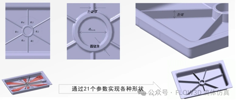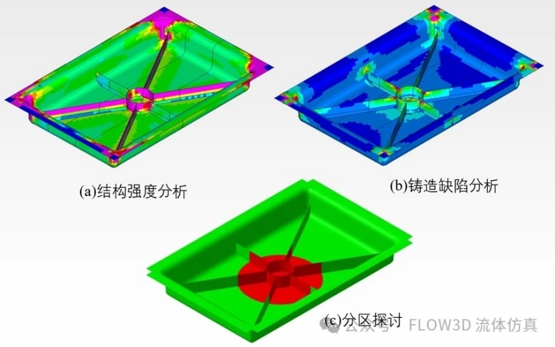 圖5 Panamera G1 的車殼 三、分析設(shè)置 通過前章節(jié)的流程進(jìn)行基礎(chǔ)模型的研究(如圖6),將零件通過應(yīng)力分析軟件計算出機械性能并分區(qū)檢視筋的效應(yīng)整理出規(guī)則,應(yīng)用于實際零件中,再繪制流道及渣包完成鑄件本體,后續(xù)通過FLOW-3D進(jìn)行充型及凝固的模擬,通過卷氣、氧化物、縮孔…等缺陷判斷來進(jìn)行優(yōu)化。