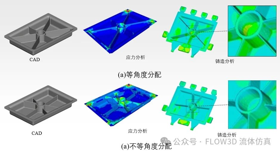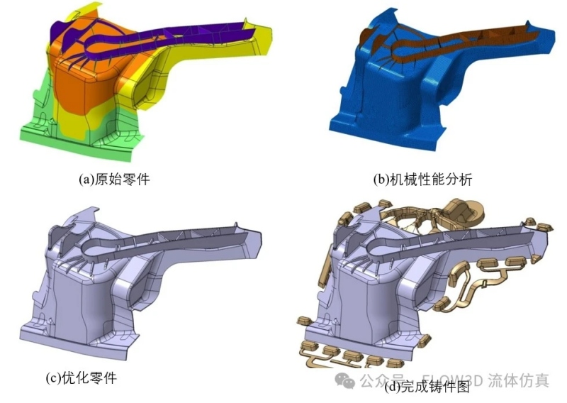 圖7 零件優(yōu)化流程 四、研究結(jié)果 基礎(chǔ)模模型研究主要是探討筋的角度、數(shù)量及高度,由圖8的分析結(jié)果可以看到等角度分配的筋在壓鑄時有卷氣存在,由圖9的分析結(jié)果可以看到減重22%仍然可以達(dá)到一定要求的機械強度,并且鑄造時無明顯缺陷存在。