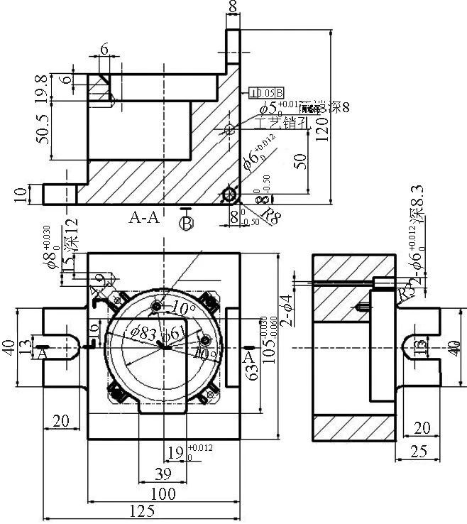 圖4 夾具體 結(jié)論 零件為壓鑄毛坯件且形狀不規(guī)則,所采用的一面兩銷定位和端蓋散熱槽轉(zhuǎn)位壓塊夾緊裝置是理想的選擇,巧妙地利用了壓鑄件尺寸一致性好的特點(diǎn),使低精度的IT10孔距安裝孔作為定位孔,防止了薄壁端蓋零件若強(qiáng)行采用三爪或平口鉗等通用夾緊方式所導(dǎo)致的零件變形。將夾具體5設(shè)計(jì)成可90°翻轉(zhuǎn)的活動(dòng)母體,輕松完成一次裝夾銑削相互空間正交的兩個(gè)軸承孔。選擇開口墊片作為重要的夾緊原件,避免了必須將壓塊螺釘全部旋出。取夾具體5俯視圖轉(zhuǎn)軸孔右、下兩面交匯處的圓角為8mm,若小于其定位尺寸8mm,則夾具體翻轉(zhuǎn)時(shí)將會(huì)出現(xiàn)卡死現(xiàn)象。 端蓋零件難以在加工中心上用鋁塊毛坯完成銑削,壓鑄是較為合適的選擇,但壓鑄精度僅為IT10左右,為了將某些關(guān)鍵部位的尺寸精度提升一個(gè)數(shù)量級(jí),機(jī)床夾具的設(shè)計(jì)及其應(yīng)用尤為關(guān)鍵。