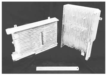 圖6 不同壓鑄工藝下的縮松縮孔數值模擬結果 2.2 壓鑄件表面質量對比與 XCT 缺陷分析 采用工藝C試制濾波器散熱殼體,LA42合金與AZ91D合金壓鑄樣件如圖7所示,對比發現,AZ91D合金樣件表面質量優良,近內澆道和遠內澆道的薄壁散熱齒均充填良好。LA42合金樣件充填基本完整,但表面可見流痕,局部存在未充滿的冷隔缺陷,這歸因于LA42合金粘度高,導致其容易粘連模具。