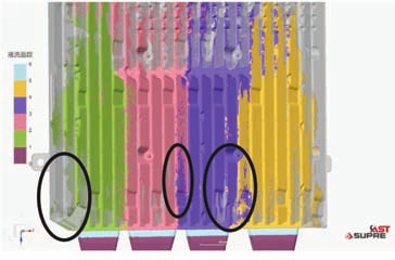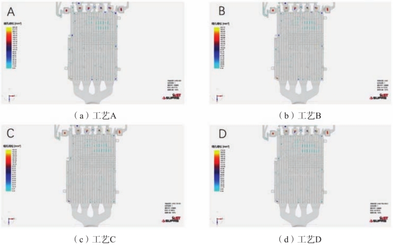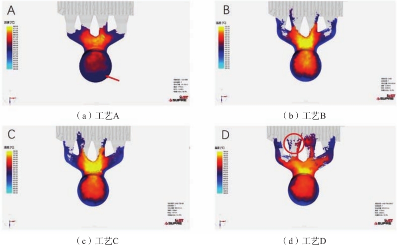 圖5 工藝B的液流追蹤數值模擬結果 如圖6所示為不同壓鑄工藝下縮松縮孔的數值模擬結果,由圖可見,從工藝A至工藝B,提高澆注溫度,縮孔縮松傾向性顯著降低,再從工藝B改進至工藝C,提高增壓壓力,縮孔縮松傾向性進一步降低。而工藝C到工藝D,澆注溫度進一步提高至760 ℃,熔體發生過熱,不同溫度凝固到相同體積時,凝固收縮越大,越容易產生縮孔縮松,所以到工藝D,縮孔縮松傾向性反而又提高了??s松縮孔的數值模擬結果驗證了工藝C的合理性。
