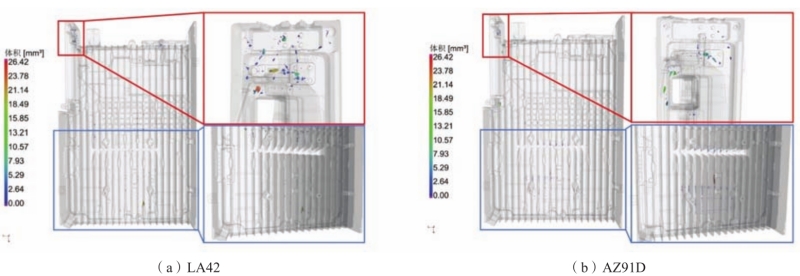 圖7 LA42與AZ91D合金濾波器殼體鑄件表面質量照片 通過XCT進一步探究鑄件內部質量,結果如圖8所示。XCT掃描分辨率136 μm,在該分辨率下,LA42合金鑄件孔隙率為0.03%,AZ91D合金鑄件孔隙率為0.02%,二者基本持平,孔洞出現位置基本與工藝C的數值模擬結果一致。兩種合金的壓鑄件孔洞缺陷均易分布在液流交匯處(圖8中紅色框)和遠內澆道端壁厚區域(圖8中藍色框)。LA42合金鑄件內部除了存在少量孔洞缺陷外,并未發現明顯的熱裂紋。這是因為即使LA42合金流動性比AZ91D差,但是其凝固區間窄,共晶反應溫度高,較高溫度下就可以對最終凝固區域進行補縮,所以熱裂傾向性較低。說明除了LA42壓鑄件表面有粘模現象外,在該工藝下,壓鑄件內部未出現大量尺寸大于100 μm的孔洞,LA42合金適合大型復雜薄壁件的充填。可進一步采用高真空壓鑄減少內部氣孔,修改模具油路以增大散熱齒模具表面溫度,從而改善鑄件質量。