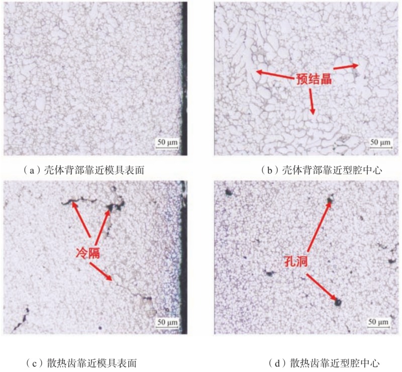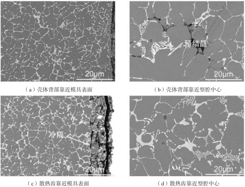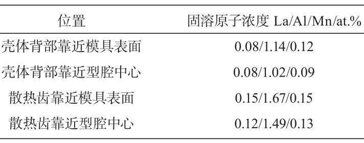 圖12 LA42合金濾波器殼體不同部位背散射照片 3 結論 (1)數值模擬結果顯示LA42合金濾波器殼體的最優壓鑄工藝是澆注溫度720 ℃,模具溫度250 ℃,增壓壓力90 MPa,采用該工藝能順利成形濾波器殼體鑄件。 (2)LA42合金濾波器殼體背部和散熱齒區域組織和性能相差較大。散熱齒區域由于高冷卻速率,晶粒細小,且含有大量固溶原子,因此熱導率低[107.7 W/(m·K)],屈服強度高(170.1 MPa),但是也伴隨著冷隔和孔洞缺陷而顯著降低伸長率。相反,殼體背部熱導率高[112.3 W/(m·K)],屈服強度低(138.4 MPa)。