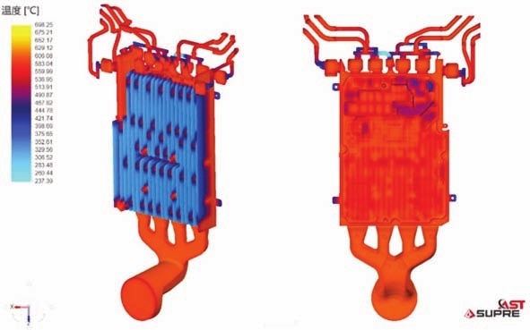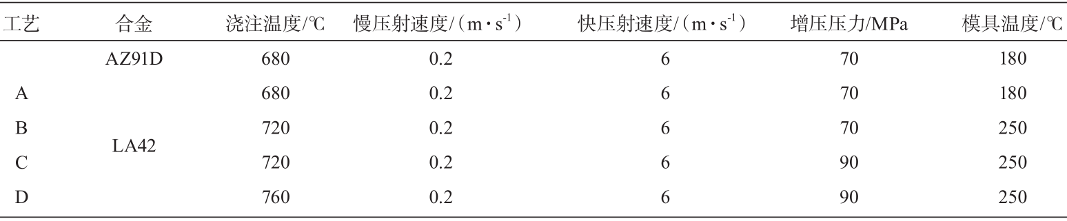 圖1 濾波器殼體壓鑄件 1 試驗材料與設備 試驗材料為LA42合金,并用商用AZ91D合金作對照試驗。通過ICP-OES測定LA42和AZ91D合金化學成分,結果見表1。濾波器散熱殼體采用壓鑄機Bulher SC140L壓鑄而成,采用的壓室長度為760 mm,冷卻時間15 s。在智鑄超云平臺(Supreium®)通過壓鑄過程數值模擬對壓鑄工藝參數進行優化選擇,具體壓鑄工藝見表2。最終采用XCT對LA42和AZ91D壓鑄件孔隙率、熱裂紋及缺陷分布進行對比評價,以評估LA42合金的成形能力。