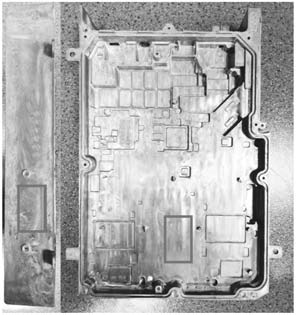 ![]() 原標題:高導熱鎂合金濾波器殼體壓鑄工藝、組織與性能研究 摘要 以Mg-4La-2Al-0.3Mn(LA42)合金為研究對象,利用OM、XCT、數值模擬等方法,對比AZ91D常規壓鑄工藝,優化出適用于LA42合金濾波器殼體的壓鑄工藝。研究表明,濾波器殼體的最優壓鑄工藝是澆注溫度720 ℃、模具溫度250 ℃、增壓壓力90 MPa。該工藝下成形的濾波器殼體,其背部與散熱齒的顯微組織與性能相差較大。殼體背部冷卻速率慢,晶粒尺寸大,伴隨大量預結晶組織,而散熱齒冷卻速率快,晶粒尺寸細小,伴隨冷隔和孔洞缺陷。散熱齒熱導率[107.7 W/(m·K)]低于殼體背部熱導率[112.3 W/(m·K)]。散熱齒屈服強度(170.1 MPa),遠高于殼體背部屈服強度(138.4 MPa)。但散熱齒區域因為含有明顯冷隔和孔洞缺陷,顯著影響伸長率。 傳統的壓鑄鎂合金AZ91D有出色的鑄造性能(流動性、抗熱裂性等),廣泛應用于電子通訊領域。但隨著設備集成度的提高,體積縮小,設備功耗增加,AZ91D合金由于含有大量固溶原子造成電子運輸過程中散射,導致其熱導率僅有51 W/(m·K),無法滿足設備的散熱需求。針對此問題,作者團隊曾開發了適用于壓鑄的高導熱鎂合金LA42(Mg-4La-2Al-0.3Mn,wt.%),其熱導率可達110 W/(m·K),壓鑄試驗拉伸棒屈服強度140 MPa,抗拉強度240 MPa,伸長率12%。但實際應用過程中,產品大多數具有結構復雜、尺寸大、壁厚不均勻、壁薄等特征,對合金的壓鑄充填能力要求更為苛刻,壓鑄充填過程的效果最終影響壓鑄件質量。 濾波器作為通訊基站射頻的核心器件,為了保證它的高效運行,其中濾波器殼體散熱問題亟待解決,迫切需要導熱性能優異的濾波器殼體材料。如圖1所示,濾波器殼體的尺寸高達456 mm×301 mm×76 mm,散熱齒最薄處僅有1 mm。LA42合金鑄造性能比AZ91D合金略差,采用常規壓鑄工藝生產濾波器殼體無法獲得質量優良的零部件。本工作通過壓鑄工藝數值模擬優化,獲得適用于大型薄壁LA42合金濾波器殼體的壓鑄工藝,并對鑄件本體顯微組織與性能進行分析,以探討LA42鎂合金在濾波器殼體上推廣應用的可行性。