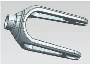 電動(dòng)滑板車比傳統(tǒng)電動(dòng)自行車結(jié)構(gòu)簡(jiǎn)單、車輪小、輕巧簡(jiǎn)便,能節(jié)省大量社會(huì)資源。是現(xiàn)代人用來(lái)作為代步工具、休閑娛樂(lè)的一種新型的綠色環(huán)保的產(chǎn)物。前叉部件在電動(dòng)車結(jié)構(gòu)中處于前方部位,它的上端與車把部件相連接,車架部件與前管配合,下端與前軸部件配合,組成電動(dòng)車的導(dǎo)向系統(tǒng)。由于位置的特殊性,因此對(duì)前叉零件的質(zhì)量要求比較高,特別是其強(qiáng)度。目前主要采用金屬型重力鑄造或鍛造方法,重力鑄造電動(dòng)車前叉零件致密性和強(qiáng)度不高,生產(chǎn)效率較低,而采用鍛件性能好,但是機(jī)械加工量大,成本高。結(jié)構(gòu)件的壓鑄生產(chǎn)多采用半固態(tài)或真空壓鑄,這都會(huì)為壓鑄生產(chǎn)過(guò)程增加工序,工藝更加復(fù)雜,生產(chǎn)成本增加。為此,本文通過(guò)采用低含氣量壓鑄工藝為某高端電動(dòng)滑板車生產(chǎn)企業(yè)開發(fā)前叉壓鑄件,基于智鑄超云壓鑄CAE云計(jì)算平臺(tái)進(jìn)行壓鑄工藝的模擬仿真,通過(guò)模擬分析可預(yù)測(cè)卷氣、縮松、縮孔等缺陷,并進(jìn)行工藝的優(yōu)化,從而可有效避免壓鑄缺陷的產(chǎn)生,縮短開發(fā)周期,提高鑄件品質(zhì),降低成本,為該類鑄件的壓鑄生產(chǎn)提供參考。 1 壓鑄件分析及工藝設(shè)計(jì) 1.1 前叉壓鑄件分析 該鑄件是某公司生產(chǎn)的電動(dòng)滑板車前叉三維實(shí)體,如圖1所示。最大外形尺寸為197 mm×103 mm×76 mm,毛坯重520 g,其結(jié)構(gòu)適中,但壁厚不均,薄壁處約為4.5 mm,厚壁部位超過(guò)12 mm,平均壁厚約為7 mm。壓鑄件要求沒有氣孔,能進(jìn)行T6處理,需通過(guò)滾筒測(cè)試疲勞沖擊20萬(wàn)次,要求不會(huì)產(chǎn)生裂紋、變形和斷裂。合金材料選擇A380,化學(xué)成分如表1所示。