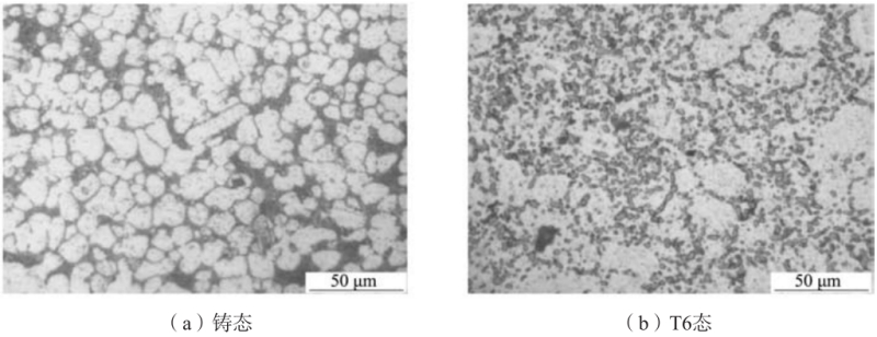 圖8 前叉壓鑄件X射線探傷圖 另外將高速位置3所生產(chǎn)的鑄件進(jìn)行525 ℃+4 h固溶處理和170 ℃+2 h時(shí)效處理,其表面沒有發(fā)現(xiàn)鼓泡現(xiàn)象。通過(guò)在前叉鑄件本體取樣進(jìn)行了力學(xué)性能測(cè)試,鑄態(tài)的抗拉強(qiáng)度260 MPa,屈服強(qiáng)度169 MPa,伸長(zhǎng)率為2.2%,T6處理后強(qiáng)度和韌性都得到了較大的提升,即抗拉強(qiáng)度提高到342 MPa,屈服強(qiáng)度為222 MPa,伸長(zhǎng)率為3.6%。鑄件的組織如圖9所示,從圖中可以看出,鑄態(tài)組織中α-Al相呈顆粒狀或近球狀,經(jīng)過(guò)T6處理后,硅相呈顆粒狀或短棒狀,同時(shí)有Al2Cu和Mg2Si等顆粒增強(qiáng)相析出,在組織分布也較為均勻,從而使得鑄件性能得到進(jìn)一步的強(qiáng)化。最后前叉壓鑄件經(jīng)實(shí)際裝車經(jīng)20萬(wàn)次疲勞沖擊強(qiáng)度測(cè)試沒有斷裂或變形,符合電動(dòng)滑板車產(chǎn)品的前叉零件技術(shù)要求。此件由2021年至2023年生產(chǎn),已生產(chǎn)近4萬(wàn)臺(tái)套。最后一批交貨的鑄件經(jīng)超115萬(wàn)次負(fù)載疲勞實(shí)驗(yàn)(圖10),鑄件仍未發(fā)生斷裂,遠(yuǎn)超前叉零件技術(shù)要求。