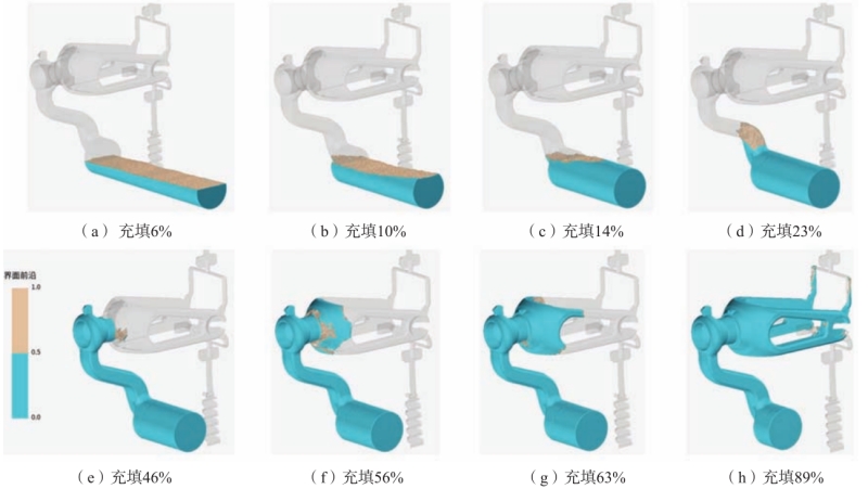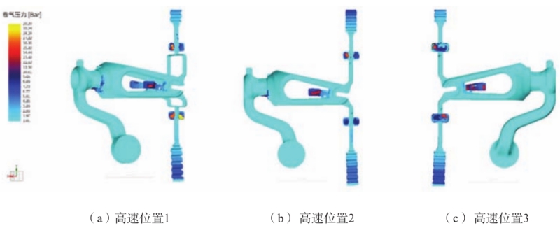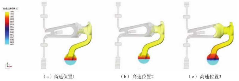 圖4 高速位置1充填過(guò)程模擬結(jié)果 為了消除前叉鑄件圓柱孔末端位置的卷氣,考慮將起高速位置往前移,如圖3b和c所示。高速位置往前移后的充型過(guò)程卷氣壓力分布的模擬結(jié)果如圖5所示。