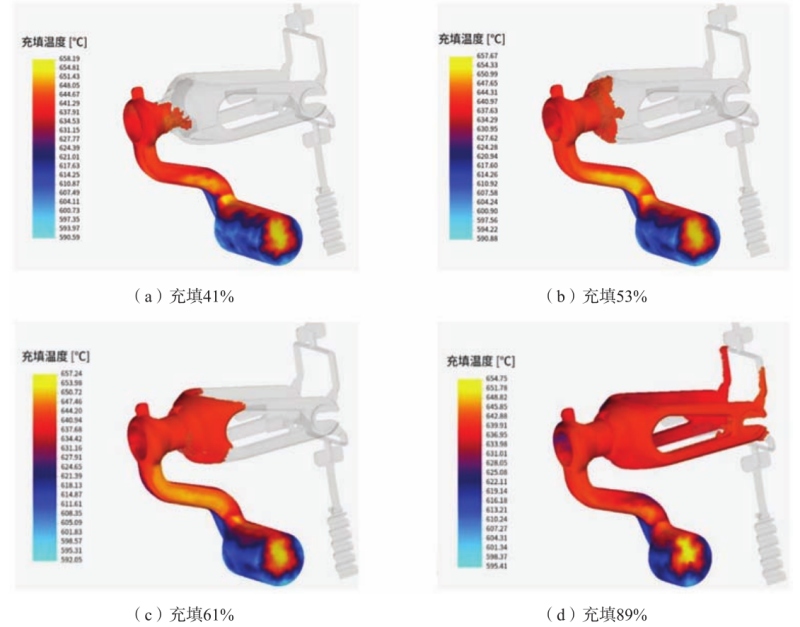 圖5 充填過(guò)程卷氣壓力分布圖 從圖中可以看出,當(dāng)起高速前移到位置2時(shí),在前叉鑄件圓柱孔末端位置的卷氣壓力有所改善,但是還沒有完全消除,如圖5b所示;當(dāng)起高速前移到位置3時(shí),在前叉鑄件圓柱孔末端位置的卷氣壓力基本消除,如圖5b所示。從圖6所示高速位置3充填過(guò)程的溫度分布圖可以看出,合金液進(jìn)入型腔后,流動(dòng)平穩(wěn),由于高速位置前移到了零件型腔中,避免了在鑄件圓柱孔末端位置產(chǎn)生大的噴射流,從而可消除該處的卷氣現(xiàn)象。
