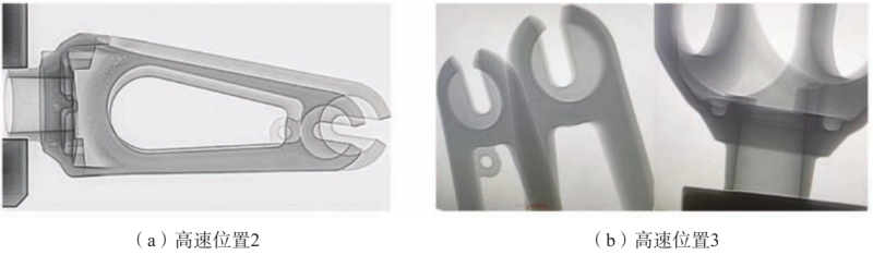圖6 高速位置3充填過(guò)程模擬結(jié)果 另外,高速位置前移會(huì)延長(zhǎng)充型的時(shí)間,增加形成冷隔、澆不足等缺陷的風(fēng)險(xiǎn)。但是,從其溫度分布圖可以看到,最后充填完型腔后合金液還具有較高的溫度,基本上都在620 ℃,高于A380鋁合金的液相線溫度(599 ℃),低溫的合金液基本上都留在了料筒中,沒有進(jìn)入型腔。 3 生產(chǎn)實(shí)踐 為了進(jìn)行驗(yàn)證模擬優(yōu)化方案的可行性,采用該壓鑄工藝開發(fā)了壓鑄模具進(jìn)行實(shí)際生產(chǎn),具體壓射工藝為:鋁熔體出爐溫度為660 ℃,低速壓射采用勻加速壓射工藝,其最高臨界速度為0.57 m/s,高速速度為4 m/s,模具溫度控制在200 ℃左右。分別采用高速位置2和3進(jìn)行了生產(chǎn)實(shí)踐驗(yàn)證,都獲得了外形輪廓清晰、表面光滑、尺寸精度高的前叉壓鑄件,前叉壓鑄件的實(shí)物圖如圖7所示。通過(guò)對(duì)鑄件整體的X光透射探傷發(fā)現(xiàn),采用高速位置2進(jìn)行生產(chǎn)的前叉壓鑄件在靠近圓柱孔末端位置存在較多的孔洞,如圖8a所示。采用阿基米德法獲得鑄件的密度為2.718 g/cm³,孔隙率為8.09‰。而采用高速位置3所生產(chǎn)的鑄件內(nèi)部沒有發(fā)現(xiàn)孔洞,如圖8b所示,將鑄件從中間剖開后也沒有發(fā)現(xiàn)縮松、縮孔、氣孔和氧化夾雜等缺陷,剖切面沒有發(fā)現(xiàn)孔洞,組織致密,如圖7b所示。鑄件的密度達(dá)到2.739 g/cm³,孔隙率僅為0.39‰。由此可見,壓鑄件的孔隙率遠(yuǎn)小于2%的壓鑄件標(biāo)準(zhǔn),同時(shí)也說(shuō)明壓鑄件的含氣量很低。