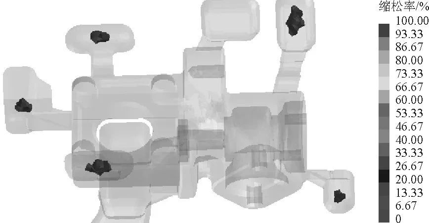 圖9 采用澆注系統(tǒng)2生產(chǎn)的鑄件縮孔分布模擬結(jié)果