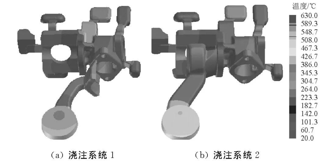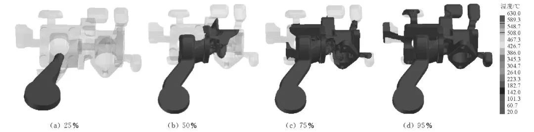 圖7 鑄件凝固后的溫度場 澆注系統(tǒng)1縮孔缺陷預(yù)測結(jié)果見圖8。由圖8可知,鑄件在壁厚區(qū)域的地方產(chǎn)生了縮孔缺陷,鑄件產(chǎn)生的縮孔體積為0.46cm3(去除溢流槽),切面處縮孔率為80%~90%,可以看出,澆注系統(tǒng)2也在鑄件厚壁區(qū)域產(chǎn)生縮孔缺陷,其產(chǎn)生的縮孔體積為0.16 cm3,切面處的縮孔率為80%~85%,比澆注系統(tǒng)1產(chǎn)生縮孔缺陷少,其主要原因是金屬液在澆注系統(tǒng)1條件下開始充填厚壁區(qū)域的時(shí)間較早,在凝固時(shí)厚壁區(qū)域溫度高,凝固速率慢,更易產(chǎn)生孤立液相,產(chǎn)生縮孔缺陷,因此澆注系統(tǒng)2更優(yōu)。