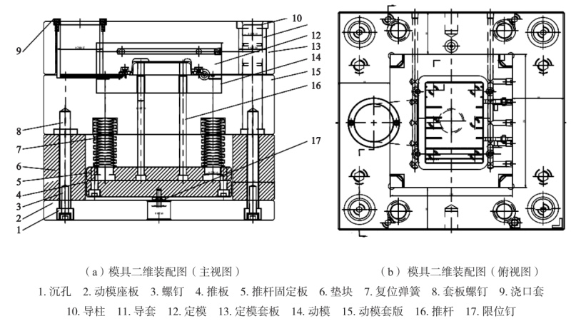圖 9 壓鑄件分型面確定及澆道設計 根據壓鑄件最大截面及澆排系統投影面積,結合40 MPa注射壓力推薦值計算,得鎖模力1 099 kN,選用J1113G臥式冷室壓鑄機。然后經過壓室實際容量的核算,選擇Φ60 mm滿足設計要求。 3.2 模具參數計算 壓鑄機決定壓鑄模厚度范圍,壓鑄機動座板行程則決定取出壓鑄件所需的距離。根據鑄件大小和所需安全值,壓鑄件脫模取出所需最小距離為85 mm,小于所選壓鑄機動模座板最大行程350 mm,符合要求;內澆道深度為1.8 mm,取扇形澆道入口厚度為10 mm,寬度為8.6 mm,測量開口角為60°,符合要求。根據零件結構,模具設計兩個溢流槽,又根據鑄件溢流槽的容積占比,確定溢流槽半徑8 mm,溢流口長12 mm,厚0.8 mm。 3.3 壓鑄模具裝配 鋁合金信號放大器壓鑄模見圖10所示。定模12固定在澆口套9一側的定模套板13上,動模14被固定在動模套板15上。壓鑄機工作時,模具合模,活塞壓射鋁液充滿型腔,保壓后直接開模,當動模和定模分開到能方便取出鑄件的一定距離時停止。然后,頂出機構通過頂桿固定板5和頂桿16傳遞推力將鑄件頂出,最后動模14通過彈簧復位機構7復位。