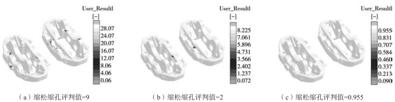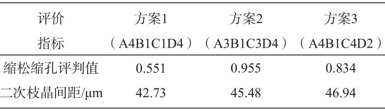 表5 均值和極差分析表 2.4 優(yōu)化方案的確定及試制驗(yàn)證 基于對(duì)上述工藝參數(shù)對(duì)評(píng)價(jià)指標(biāo)的影響規(guī)律分析,確定的優(yōu)化方案如下: (1)縮松縮孔缺陷是實(shí)際鑄件生產(chǎn)過程中首先需解決的鑄造缺陷,工藝方案應(yīng)首先保證鑄件中無(wú)縮松縮孔缺陷,使縮松縮孔評(píng)判值最小的工藝組合方案為A4B1C1D4。在確保鑄件沒有縮松縮孔缺陷的同時(shí),二次枝晶間距應(yīng)當(dāng)越小越好,以提高鑄件的力學(xué)性能。根據(jù)極差分析的結(jié)果,模具預(yù)熱溫度對(duì)二次枝晶間距的影響最大,而對(duì)縮松縮孔評(píng)判值的影響最小。由于模具預(yù)熱溫度對(duì)減小二次枝晶間距和縮松縮孔缺陷的最優(yōu)水平均為C1,因此可將工藝參數(shù)組合A4B1C1D4作為第一組優(yōu)化方案。(2)正交試驗(yàn)的結(jié)果中有兩組工藝參數(shù)組合沒有縮松縮孔缺陷,分別是第9組(A3B1C3D4)和第13組(A4B1C4D2),因此可將該兩組的工藝方案分別作為第二組和第三組優(yōu)化方案進(jìn)行比較。 上述的優(yōu)化方案數(shù)值模擬的結(jié)果如表6所示。3個(gè)優(yōu)化方案的縮松縮孔評(píng)判值均小于1,即均不發(fā)生縮松縮孔缺陷。其中方案1的縮松縮孔評(píng)判值最小,且對(duì)應(yīng)的二次枝晶間距也最小,因此,綜合上述分析,將方案1(A4B1C1D4)作為最優(yōu)工藝方案,即澆注時(shí)間為28 s,澆注溫度為 700 ℃,模具預(yù)熱溫度為300℃,冷卻水溫度為 35℃。