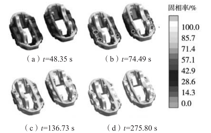 表1 A356鋁合金的熱物性參數(shù) 1.3 原始工藝數(shù)值模擬結(jié)果分析 圖2是制動(dòng)鉗鑄件在原始工藝下凝固過程中的固相率變化,模擬結(jié)果表明,鑄件整體上有呈順序凝固的趨勢(shì),即從鉗體頂端和兩側(cè)薄壁處先凝固,并逐漸向兩側(cè)活塞孔所在厚壁處凝固。但由于活塞孔兩側(cè)部位較為厚大,傳熱困難,容易出現(xiàn)孤立液相區(qū),在凝固時(shí)間為74.49 s和136.73 s時(shí)分別出現(xiàn)如圖中圈出部位所示的孤立液相區(qū),由于是采用一模兩件工藝,故圖中的孤立液相區(qū)呈對(duì)稱分布。在金屬型重力鑄造的鑄件凝固過程中,孤立液相區(qū)無(wú)法通過重力作用和冒口進(jìn)行補(bǔ)縮,隨著凝固過程體積的收縮將會(huì)出現(xiàn)縮松縮孔缺陷。