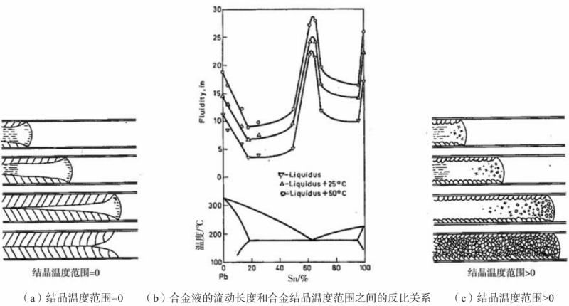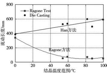 圖2 Ragone試驗法和Han試驗法制備的壓鑄件 2 試驗結果及分析 2.1 流動性和合金間隔的關系 用表1所列合金實測了兩種鑄造條件下的流動長度,所測得的流動長度和合金的結晶溫度范圍之間的關系見圖3。用Ragone方法獲得的試驗數(shù)據(jù),呈現(xiàn)出合金流動性和合金結晶溫度范圍之間的反比關系,與圖1所示的著名試驗結果一致。試驗結果表明,在重力鑄造條件下,麻省理工的流頭阻塞理論,不僅適用于如圖1所示的二組元合金,也適用于多組元商業(yè)合金。 然而,圖1所示的壓鑄條件下的流動性和結晶溫度范圍的規(guī)律與重力鑄造條件下的規(guī)律完全相反。使用Han方法所獲得的壓鑄條件下試驗數(shù)據(jù)如圖3所示,合金的流動性隨合金的結晶溫度范圍增加而增加,這一趨勢與重力鑄造條件下的趨勢完全不同。例如,純鋁(結晶溫度范圍等于0)在重力鑄造條件下的流動性應該優(yōu)于結晶溫度范圍大于0的合金,但在壓鑄條件下,其流動性反而低于結晶溫度范圍大于0的合金。為此,圖3所示的試驗結果預示著壓鑄條件下金屬液充型流動的停止機理與重力鑄造條件下的流動停止機理存在不同之處。