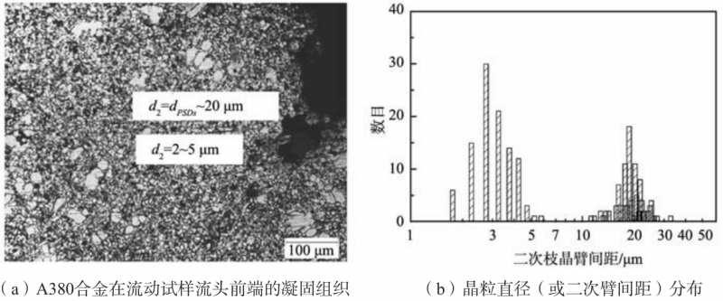 表3 二次枝晶臂間距和用公式(2)和(3)計算的局部凝固時間以及平均冷卻速度 2.4 A380 合金在壓鑄件中的枝晶形貌 在壓鑄過程中,當金屬液澆入壓室后受壓室急冷,開始形成一些鋁枝晶。這些枝晶通常稱為預結晶枝晶(pre-solidified dendrites,PSDs)或外生晶(Externally Solidified Crystals,ESCs)。然后,含有一定數(shù)量預結晶枝晶的金屬液被壓頭在一定的速度和壓力控制下壓入鑄型充型。這些預結晶枝晶的生長受壓頭推進所帶來的液態(tài)擾動影響,其晶體形貌介于圖5所示的形貌之間。 壓鑄件流動性試樣接近流頭的典型凝固組織見圖6a,存在兩類白色的枝晶組織。這兩類枝晶組織的尺寸呈雙峰分布,見圖6b。較大枝晶的直徑約20 μm,與圖5中的枝晶尺寸數(shù)量級接近。顯然,這些晶粒是壓室中形成的枝晶碎片,是預結晶枝晶或外生晶。較小晶粒的直徑約2~5 μm。部分小晶粒呈現(xiàn)一次枝晶臂及其整齊排列的二次枝晶臂,二次枝晶臂間距約2~5 μm。這些較小的晶粒應該是金屬液在鑄型中快冷所形成的枝晶組織。盡管圖5中的預結晶枝晶或外生晶的分布比較均勻,但是,這些預結晶枝晶在鑄件某些部位的分布極不均勻。