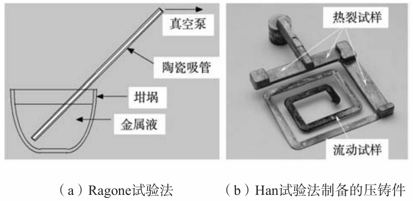 表2 試驗合金的液相線和固相線溫度,結晶溫度范圍和澆注溫度 1.2 流動性測試方法 使用了兩種方法測試合金的流動性。第一種是麻省理工開發(fā)的Ragone方法,見圖2a。合金液在表2給定的溫度下吸入內(nèi)徑4 mm室溫陶瓷管,真空泵的壓力控制在82 cm水柱。陶瓷吸管的水平度對試驗結果影響不大。詳細的Ragone試驗方法參見麻省理工已發(fā)表的文獻。Ragone方法被認為是在重力鑄造條件下研究合金流動性的最精確的方法。 第二種是作者在橡樹嶺實驗室開發(fā)的Han方法。作者使用一臺128 t鎖緊力的壓鑄機,用H13鋼模具制備如圖2b所示的壓鑄件。模溫130 ℃,壓室內(nèi)徑5.08 cm,壓頭最高速度254 cm/s,最大壓強13.8 MPa。詳細的壓鑄試驗條件參見作者已發(fā)表的文獻。鑄件由三段熱裂試樣和一段回形流動性試樣組成,可同時用于測定合金的熱裂傾向和流動性。熱裂試樣厚6 mm,寬32 mm,長分別為57 mm,76 mm,127 mm。回形流動性試樣厚1 mm,寬15 mm,長914 mm。熱裂試樣可視為壓鑄件的橫澆道,流動性試樣的入口可視為壓鑄件的內(nèi)澆道。回形的邊長隨合金液的充型流動而遞減。這樣的流動性試樣設計,使壓鑄條件下離散的流頭液滴獲得一定的形狀規(guī)范,從而減小離散流頭液滴由于與主流充型液流分離而帶來的流動長度測量誤差。然而,即使使用這樣的回形流動試樣,凝固后的流頭仍然極易在鑄件脫模時從鑄件本體脫落而成為碎片,帶來一定的試驗誤差。 1.3 壓室中的凝固組織模擬 在圖2b所示的熱裂試樣和流動試樣中,往往含有部分在壓室中形成的枝晶組織。為區(qū)別壓室內(nèi)形成的枝晶組織和鑄型內(nèi)形成的組織,選用A380鋁合金,在表2中的過熱度條件下,澆入與壓室內(nèi)徑相同的鋼管,開展了兩個凝固試驗,以揭示壓鑄條件下合金液流動停止機理。第一個是合金液自然凝固,以確定合金的二次枝晶臂間距。第二個是合金液在高強超聲攪拌作用條件下的凝固,近似模擬金屬液在壓室中受到強制擾動時破碎枝晶的形貌。詳細的試驗條件參見作者已發(fā)表的文獻。