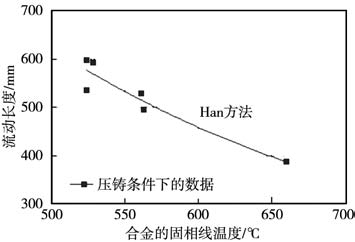 圖4 壓鑄條件下實測的合金流動長度與計算的合金固相線溫度之間的關系