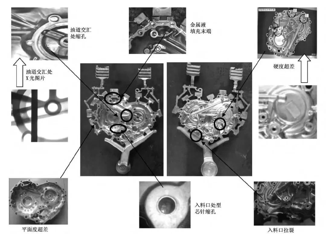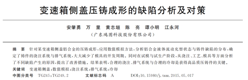 廣東鴻圖科技股份有限公司工程師安肇勇等在《特種鑄造及有色合金》期刊上發(fā)表了題為“變速箱側(cè)蓋壓鑄成形的缺陷分析及對(duì)策”的文章,作者針對(duì)某變速箱側(cè)蓋鋁合金的壓鑄成形,應(yīng)用數(shù)值模擬方法,分析鋁合金液體流動(dòng)充型狀態(tài)與鑄件缺陷的分布,確定了鑄件的澆注系統(tǒng)與排氣系統(tǒng),大大減少了模具的開發(fā)周期。同時(shí)在試模與試生產(chǎn)階段,從澆注、工藝、模具等方面分析了不同缺陷產(chǎn)生的原因,提出了改善措施。結(jié)果表明,合理的澆注、排氣系統(tǒng)與合理的冷卻是獲得高品質(zhì)壓鑄件的關(guān)鍵。 圖文結(jié)果 本課題開發(fā)的汽車變速箱側(cè)蓋壓鑄件見圖1。該鑄件輪廓尺寸為425 mm×355 mm×71 mm,質(zhì)量為3.3kg,平均壁厚為2.3mm,投影面積為112280mm2鑄件材質(zhì)為Al-11Si-2Cu,有多處厚壁熱節(jié)部位,易產(chǎn)生縮孔缺陷;產(chǎn)品毛坯平面度要求為0.6 mm,外觀無明顯的壓痕;產(chǎn)品加工后密封面氣縮孔為Φ0.5~1.0mm的允許1個(gè),小于Φ0.5mm的允許2個(gè),軸承孔機(jī)加工后不允許有氣縮孔外露;內(nèi)腔試漏壓力為0.05MPa,泄漏量≤8mL/min,油道試漏壓力為0.3 MPa,泄漏量≤8mL/min;硬度(HB)≥58。該鑄件在13500kN的壓鑄機(jī)上生產(chǎn)。