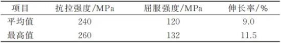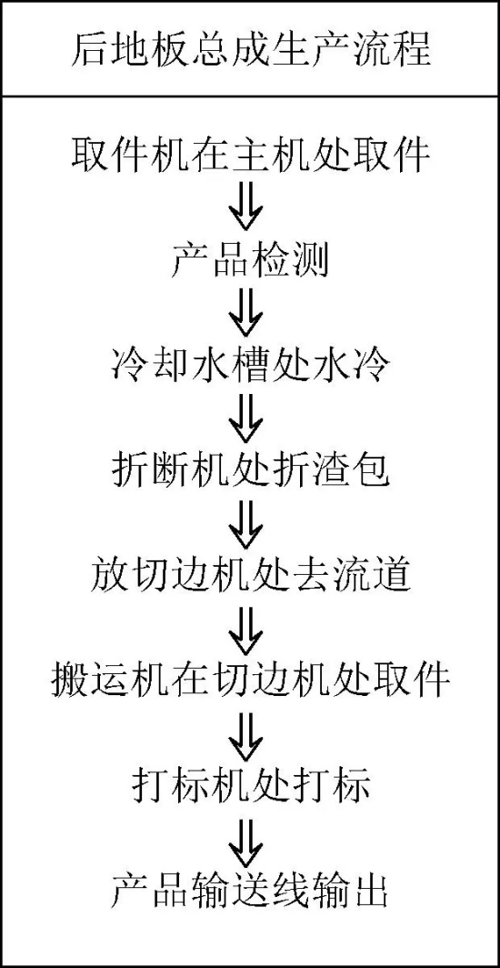 圖9 超大型壓鑄單元雙定量爐給湯方案 使用120 000 kN超大型壓鑄機(jī)生產(chǎn),配置雙定量爐給湯方案、雙噴涂系統(tǒng)、模溫控制系統(tǒng)、模溫反饋系統(tǒng)、超高真空系統(tǒng)以及壓鑄島。壓鑄島主要工序流程有取件-檢測-冷卻-折渣包-切邊-打標(biāo)-輸送等,見圖10。通過以上的一體化壓鑄單元的設(shè)備解決方案,使得后地板總成可以順利量產(chǎn),其節(jié)拍為120 s,鑄造壓力低至約30 kPa,高速速度約為5.5 m/s,具體壓鑄工藝參數(shù)見表2和表3。其節(jié)拍主要通過壓鑄單元布局、優(yōu)化給湯時(shí)間、優(yōu)化噴涂時(shí)間以及冷卻時(shí)間得以保證,低壓、低速工藝主要通過壓鑄機(jī)性能、模具溫度控制、超高真空工藝等來保證。鋁合金壓鑄件由于其工藝特點(diǎn),在模具中流動(dòng)形成鋁液溫度損失,導(dǎo)致零件本體近澆口端和末端力學(xué)性能均存在差異。隨著一體化壓鑄零件尺寸加大,鋁液流程變長,壓鑄件近端與遠(yuǎn)端力學(xué)性能差異更明顯。通過一體化壓鑄單元設(shè)備生產(chǎn)的后地板總成,其力學(xué)性能見表4,滿足汽車使用要求。