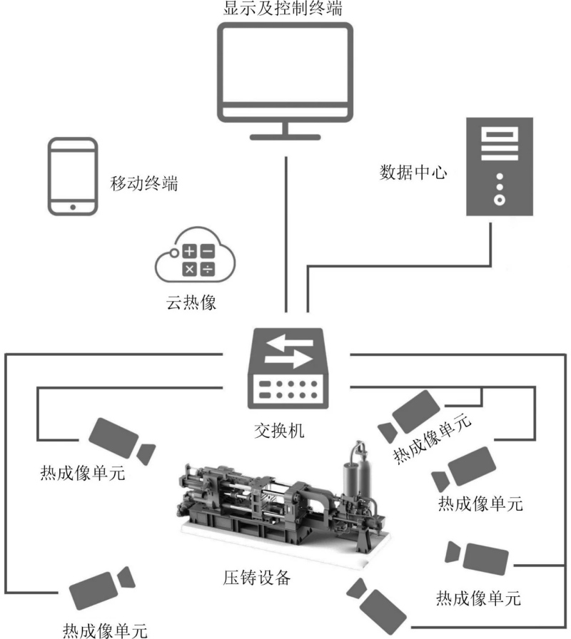 圖4 模具溫度檢測系統(tǒng) 生產(chǎn)單件一體化壓鑄件成本非常高,對壓鑄生產(chǎn)過程進(jìn)行管控是其中一種應(yīng)對措施。模具表面溫度是動(dòng)態(tài)的工藝參數(shù),在每個(gè)鑄造周期內(nèi)都必須保持在最佳且均勻的范圍內(nèi),這會(huì)影響鑄件品質(zhì)和模具壽命。前艙、后地板、電池托盤在生產(chǎn)過程中的溫差較大,必須對生產(chǎn)過程中的模具溫度進(jìn)行監(jiān)測及記錄并實(shí)時(shí)反饋異常,以保證產(chǎn)品的品質(zhì)。紅外熱成像在線監(jiān)測系統(tǒng)通過高達(dá)數(shù)十萬個(gè)以上的測溫點(diǎn)數(shù)據(jù)實(shí)時(shí)形成清晰的熱像圖,可以直觀分析被測物體表面任何點(diǎn)或關(guān)注區(qū)域(ROI)溫度變化情況,對比工作循環(huán)的相同階段前后數(shù)據(jù),找到溫度分布正確優(yōu)化的依據(jù),通過預(yù)設(shè)溫度閾值實(shí)現(xiàn)報(bào)警提示,原理見圖4。由于一體化壓鑄件產(chǎn)品尺寸大,進(jìn)澆口到水尾的渣包口流程長,增壓不能在鋁液凝固前傳達(dá)到水尾部位,為保證產(chǎn)品的內(nèi)部品質(zhì)及力學(xué)性能,真空工藝的應(yīng)用十分重要。應(yīng)對一體化壓鑄件全新設(shè)計(jì)的真空系統(tǒng),其靜態(tài)真空度可以達(dá)到500 Pa,動(dòng)態(tài)真空度達(dá)到3 kPa,真空罐采用10 m3,動(dòng)定模側(cè)各采用4個(gè)真空閥對型腔進(jìn)行抽真空,最快關(guān)閥時(shí)間達(dá)30 ms。圖5為真空系統(tǒng)示意圖,通過管道對料槽、模具動(dòng)模側(cè)、模具定模側(cè)進(jìn)行抽真空,以達(dá)到減少充填阻力,降低產(chǎn)品含氣量,提高產(chǎn)品品質(zhì)的目的。
