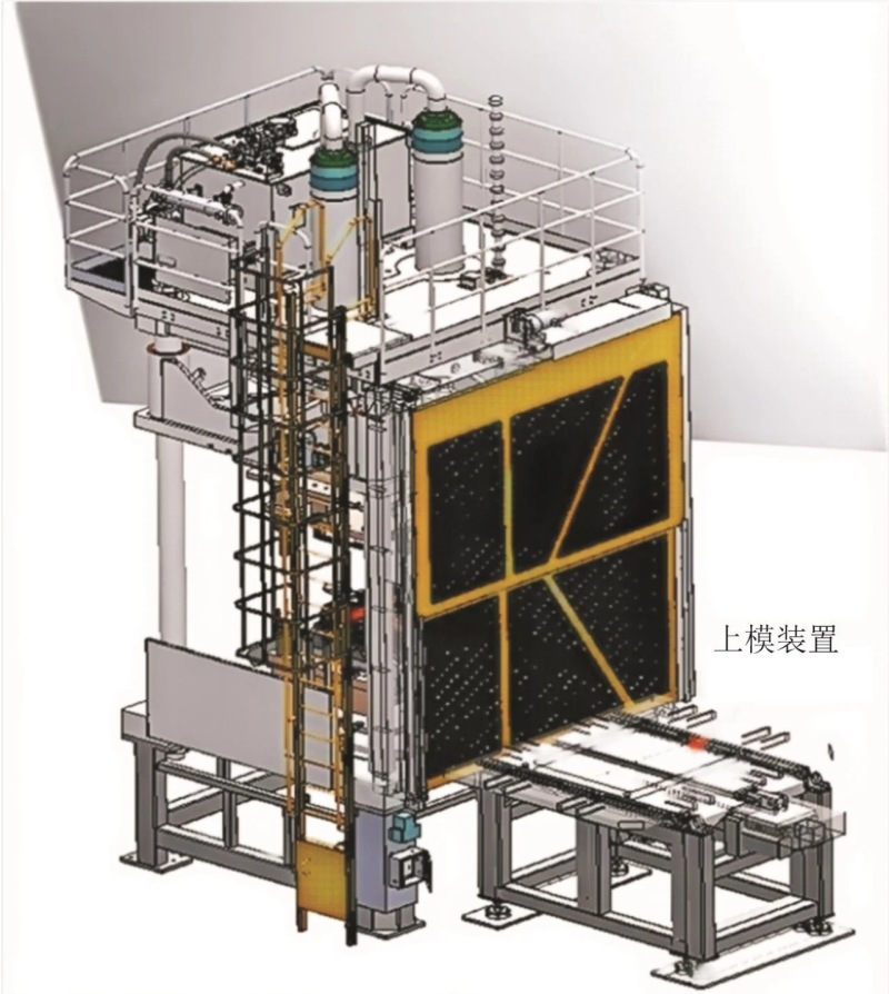 ![]() 汽車批量化生產(chǎn)以來,汽車白車身生產(chǎn)工藝需經(jīng)歷沖壓及焊接兩個(gè)工藝,而一體化壓鑄則直接由熔化的金屬液澆注、整形和冷卻成形。汽車輕量化是節(jié)能減排的關(guān)鍵技術(shù)手段之一。鋁合金作為重要的輕量化材料,受到整車制造企業(yè)的廣泛關(guān)注。目前,汽車輕量化的主要手段是發(fā)展一體化壓鑄,可簡單理解為超大尺寸產(chǎn)品壓鑄成形技術(shù),產(chǎn)品主要包括前艙總成、后地板總成、電池托盤等,具有尺寸大、集成度高及一次成形等特點(diǎn)。另外,一體化壓鑄件毛坯的澆注質(zhì)量相較于傳統(tǒng)件增大許多。基于此,必須研發(fā)更大鎖模力的壓鑄機(jī)、產(chǎn)品搬運(yùn)設(shè)備、壓鑄島設(shè)備以滿足一體化壓鑄件的成形、產(chǎn)品輸出轉(zhuǎn)運(yùn)及產(chǎn)品澆道渣包的去除。澆注質(zhì)量增加,會(huì)導(dǎo)致鋁液倒料時(shí)間延長,為了減小鋁液降溫的影響,必須研發(fā)給湯速度更快的設(shè)備。因此傳統(tǒng)的壓鑄元素,包括設(shè)備、材料、工藝、模具等都需要突破甚至顛覆原來的技術(shù),才能滿足前艙、后地板及電池托盤的生產(chǎn)。一體化壓鑄件的生產(chǎn),必須解決產(chǎn)品尺寸過大導(dǎo)致的壓鑄機(jī)合模力需求大增、鑄件流程過長導(dǎo)致的模具溫度平衡、生產(chǎn)節(jié)拍過長、產(chǎn)品變形、保溫爐局限導(dǎo)致的鋁液質(zhì)量不高以及給湯效率問題。針對這些問題,提出一體化壓鑄單元設(shè)備的解決方案,包括壓鑄單元布局、模具的噴涂潤滑、鋁液的供給、模具溫度的平衡控制、壓鑄超高真空控制技術(shù)等。本研究介紹了一體化壓鑄件壓鑄單元設(shè)備的解決方案,旨在為一體化壓鑄生產(chǎn)提供參考。 圖文結(jié)果 新能源汽車前艙等大型鋁合金壓鑄件生產(chǎn)過程如下:原材料以鋁錠形式由貨車運(yùn)輸?shù)焦S,經(jīng)叉車轉(zhuǎn)運(yùn)至車間內(nèi)鋁錠存放區(qū)。熔煉爐將原材料熔煉成鋁液后轉(zhuǎn)至保溫爐,給湯機(jī)從保溫爐取料給湯到壓鑄機(jī),壓鑄機(jī)壓鑄成形后,由機(jī)器人取件,進(jìn)行產(chǎn)品檢測、水冷、渣包切除、激光打碼、料餅切除,檢測合格后從壓鑄島下線,經(jīng)去毛刺和X光檢測后,合格件被運(yùn)往機(jī)加工區(qū),不合格件進(jìn)入廢料區(qū)等待切割后回爐使用,設(shè)備開機(jī)時(shí)生產(chǎn)的熱模件和正常生產(chǎn)狀態(tài)下等切割的料餅均可經(jīng)破碎后作為回爐料使用。 壓鑄單元的配套設(shè)備有:噴涂機(jī)器人及噴涂系統(tǒng)、取件機(jī)器人及取件系統(tǒng)、產(chǎn)品檢測裝置、產(chǎn)品冷卻水槽、去渣包裝置、等離子切割(或者大型壓床和沖模的沖切方式)、矯形裝置、打碼站、點(diǎn)冷機(jī)、真空機(jī)、模溫控制系統(tǒng)、模溫?cái)?shù)據(jù)監(jiān)測反饋系統(tǒng)和油污收集器等,與壓鑄機(jī)組成一個(gè)完整的系統(tǒng)。周邊設(shè)備的布置形式及數(shù)量應(yīng)根據(jù)具體產(chǎn)品的工藝要求而定,生產(chǎn)節(jié)拍應(yīng)與壓鑄機(jī)相匹配。為了獲得最大的空間利用率,最有效率的物流路線,最佳的生產(chǎn)流程以及最短的生產(chǎn)節(jié)拍,必須對以上壓鑄單元的所有設(shè)備進(jìn)行合理的布局。以鴻圖120 000 kN壓鑄單元為例,產(chǎn)品為前艙、后地板,布局設(shè)計(jì)方案見圖1。