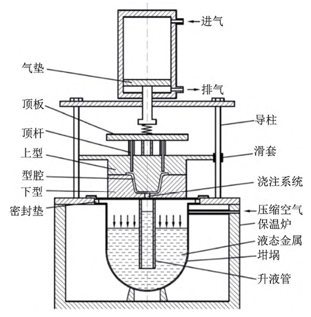 圖1 置頂式氣壓低壓鑄造技術原理圖 常規的鎂合金低壓鑄造工藝主要采用壓縮空氣充型并保壓來完成鑄件生產。而電磁低壓鑄造技術是一種利用洛倫茲力使金屬液上升并充型的一種鑄造方法,其示意圖如圖3所示。其生產效率高、可連續、近無余量精確成形,在鎂合金低壓鑄造領域具有獨特優勢。在該工藝中,向液態金屬通以電流, 金屬液受到洛倫茲力的作用會發生定向移動。在達到較高的電流、磁場強度時,產生的力可以滿足常規低壓鑄造的要求。金屬液在計算機控制下進行充型,保證不同截面處液面平穩上升。將液態金屬注滿鑄模,并在一定凝固時間后,進行加壓、保壓,最終獲得優質鑄件。研究表明,經電磁泵低壓鑄造裝置生產的摩托車鋁合金輪轂,與傳統低壓鑄造生產的輪轂相比,具有明顯的性能優勢。但是,與鋁合金相 比,鎂合金具有比熱低、凝固潛熱低等特點,導致鎂合金液在模具型腔中的冷卻速度快,因此需要調整工藝參數,如快速充型、對模溫嚴格控制等。