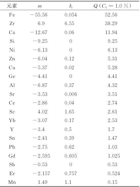 式中 m為液相線的斜率,C0 為合金中的溶質濃度, ki 為為溶質元素的分配系數。二元鎂合金中晶粒的尺寸和形態與合金中存在的溶質種類與含量直接相關:Q值越大,表明溶質在枝晶/液態前沿形成過冷區的傾向越大,產生的晶粒細化效果越顯著。在二元體系鑄造鎂合金中,常見溶質元素的Q值如表5所示。需要注意的是,表中列出的Q值僅針對 二元體系,而在實際合金中往往是三元乃至多元體系,不適用于該方程,但仍有借鑒意義。