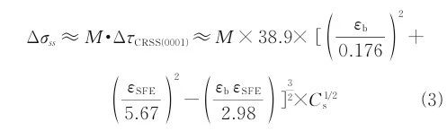 表5 常見二元鎂合金生長限制因子Q的數值 由表5可知,添加Zr,Ca和Si等Q值較高的溶質元素可以有效細化鎂合金晶粒。Fe元素雖然Q 值最高,但對鎂合金耐腐蝕性能有著不利影響,因此一般不考慮以Fe作為鎂合金的合金元素。Zr元素的Q值僅次于Fe,其晶體結構為密排六方晶格,將 Zr添加于不含Al和Mn的鎂合金(如Mg-RE,Mg Zn-RE等)中可顯著細化晶粒;而Zr和Al,Mn, Si,Fe等元素極易發生反應形成穩定的金屬間化合物,這些化合物通常在凝固后期形成,不能作為形核核心細化組織;Zr的額外消耗導致其細化效果進一步降低,雙重作用限制了Zr在含Al和Mn等鎂合金中的應用。Ca元素的Q值也較高,且Ca與Al會 反應原位生成Al2 Ca,與Mg的晶格匹配度較高,可以成為鎂基體的有效異質形核核心,在Mg-Al系合金中作為晶粒細化劑有很大的應用潛力,近些年也得到廣泛研究。除表5中所列元素外,Wang等在AZ31鎂合金中添加0.01%Ti(質量分數)后,晶粒尺寸顯著降低;經過計算得到Ti的Q值為59500,比 Mg-Zr體系中的生長限制因子高4個數量級,表明 Ti作為溶質元素其極高的成分過冷能力導致了 AZ31合金的高效晶粒細化。 還有一些元素會和鎂合金熔體中其他溶質元素發生反應形成穩定的金屬間化合物,這些顆粒有些可作為凝固過程中的形核核心,有些則會偏聚于晶界阻礙晶粒長大,最終起到晶粒細化效果,如添加 Mn和RE元素等。Mn是為數不多的能與Mg發生包晶反應的元素之一,因此雖然Mn的Q值很低, 但仍被作為鎂合金的細化元素被廣泛研究,但Mn 通常在熔體過熱處理后才能起到精煉作用,向AZ91 合金中添加少量Mn,在過熱反應后可以顯著細化晶粒。向鑄造鎂合金中添加一些稀土元素,往往也能起到明顯的晶粒細化效果。Wang等在Mg-Al 體系中添加La,Pr和Ce后,鑄錠晶粒顯著細化,這主要歸因于固-液界面前沿RE元素偏析對晶粒生長的限制,這一假設基于在鑄造鎂合金晶界上觀察到的含RE的金屬間化合物。Chia等也支持這一觀點,他們在Mg中加入La,Ce和Nd,得到了相似的晶粒細化結果。 除加入合金元素外,在低壓鑄造鎂合金熔體中加入作為晶粒細化劑的固體顆?;蛟簧深w粒, 可以增加凝固過程中形核晶粒的數量以起到晶粒細化的效果。對于Mg-Al合金而言,加C是一種有效的晶粒細化方法,在工業上已有成熟應用,但人們對其晶粒細化機理還不清楚。該方法僅在添加鋁(通常Al含量大于2%)的鎂合金中有效,且Be,Zr,Ti 和稀土元素的存在對晶粒細化有不良影響。在Mg Al合金中添加SiC顆粒可以降低晶粒尺寸,但其機 理尚不明確。一些研究者認為,當SiC加入熔體中 時,形成了Al4 C3 ,并起到形核劑的作用;另一些研究者則認為Al2 MgC2 起形核劑的作用;還有人認為Mg 顆粒直接在SiC顆粒上形核。Liu等研究發現在 Al-Ti-C 中間合金中,TiC顆??偸且栏皆贏l4 C3 顆 粒周圍,形成Al4 C3 +TiC顆粒團,試驗表明該顆粒團對純鎂有顯著的細化作用。除上述之外,Al-Ti-B 細化劑,NbB2 ,ZrB2 ,Mg24 Y5 ,TiB2 等顆粒及稀土等在 含鋁低壓鑄造鎂合金里也展現出良好的晶粒細化效果,但晶粒細化效果還有待進一步提高。 近年來也報道了適用于含鋁和不含鋁鎂合金低壓鑄造的快速凝固技術、超聲波晶粒細化技術和高強熔體剪切晶粒細化技術??焖倌碳夹g可以使鑄件在凝固過程中的冷卻速度加快,從而抑制晶粒的長大,鑄件的冷卻速度越快,晶體的生長時間越短, 晶粒的尺寸就會變得更小,因此,低壓鑄造快速凝固技術可以有效細化鑄件的晶粒結構。高強熔體剪切晶粒細化技術通過在熔體中產生大量的MgO作為 形核劑而有效地細化晶粒。 綜上所述,盡管研究工作已經進行了幾十年,但仍然沒有一種經濟可靠的晶粒細化技術可用于工業生產。因此,有必要進行更多的研究工作,如進一步了解鐵、錳等雜質對含鋁鎂合金晶粒細化的影響,研究不同方法的晶粒細化效率與鎂合金純度的關系等,尋找鎂合金微觀組織細化的新方法,以擴大鎂及其合金的應用。 4.2 固溶強化 固溶是合金元素在鎂合金中的重要存在形式,溶質原子固溶于Mg基體中,會引起系統能量的升高,同時增加滑移變形的阻力,最終導致基體強度增加,起到固溶強化效果。鎂合金的固溶強化效果由尺寸錯配度εb 、化學錯配度εSFE 及溶質原子濃度Cs 決定,其中εSFE 根據廣義堆垛層錯能(Stacking Fault Energy)的變化計算。由于密排六方(hcp)金屬下的主要滑移方式為基面滑移,根據第一性原理近似表示鎂合金的固溶強化效果Δσss :