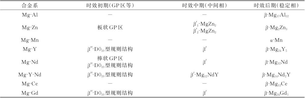 表6 鑄造鎂合金常規熱處理類型 對鎂合金進行固溶處理后再進行人工時效 (T6)可以提高鎂合金的強度,這種工藝主要應用于 Mg-Al-Zn 和 Mg-Er-Zr 合金。但 T6處理后鎂合金的塑性往往會有所降低。表7統計了幾類鑄造鎂合金的典型時效析出相,在第3節中已展開詳細討論,此處不再贅述。 鎂合金鑄件工件尺寸和截面厚度、工件尺寸與爐膛體積容量的比例關系以及鑄件在爐膛中的放置方式等都是影響金屬熱處理工藝的主要因素。鎂合金在熱處理時對溫度控制精度的要求較為嚴格,固溶處理時允許的最大溫度波動范圍為±5 ℃。因此,需要精確控制熱處理爐的爐溫并保證其溫度分 布均勻;同時要求爐子具有良好的密封性,當熱處理溫度高于400 ℃時,必須使用保護氣氛以防止鎂合金表面氧化和燃燒。