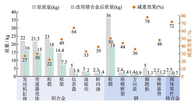 圖3 電磁泵低壓鑄造工藝原理圖 此外,吳國華等結合涂層轉移制芯技術、坩堝液體金屬密封技術與低壓鑄造技術,創新性開發出大型鎂合金鑄件精密低壓鑄造成型新工藝,保證了鎂合金液的高純度和高凈度。所制造的鎂合金鑄件組織致密、尺寸精度高、表面質量好,且已具備100 kg鎂合金鑄件研發與小批量試制能力。 2 鎂合金低壓鑄造的發展現狀 早在20世紀初,英國就提出了低壓鑄造技術, 并將該技術應用在鎂合金生產上,但受限于當時技術和設備,一直未得到大規模應用。第二次世界大戰后,汽車工業開始快速發展,對汽車輪轂等零部件的需求量不斷增加,而這類零部件也適合用低壓鑄造工藝生產,進而該技術得到迅速發展,但設備和技術僅掌握在少數發達國家手中。20世紀中葉后,各 國開始投入人力物力對低壓鑄造技術的原理和工藝進行了深入研究,隨全球化進程和科技發展,低壓鑄造的設備也在不斷升級,其應用范圍更加廣泛,現已大量應用于航空航天、汽車及各類機械產業中。 以低壓鑄造鋁合金輪轂為例,其在20世紀80年 代的市場占有率僅為4%,但到了21世紀初其市場占有率便擴大至60%以上。目前低壓鑄造已成為生產鋁合金輪轂最主要的工藝。為進一步加速汽車輕量化進程,各國廠家與研究者正加快鎂合金輪轂的研發與生產,以替代鋁合金實現更深入的輕量化,研究主要聚焦于新材料、新工藝上。研究表明, 若要獲得與鋁合金輪轂相同的剛度,鎂合金輪轂的壁厚僅需增至鋁合金輪轂的1.17倍,此時其質量也僅為鋁輪轂的78%,具有明顯輕量化效果;在新能源車上用鎂合金輪轂代替鋁合金輪轂,車輛續航能力可以提高8%以上,汽車加速性能和減振效果也得到明顯提升。目前用于鎂合金的鑄造工藝有重力鑄造、高壓鑄造、擠壓鑄造以及低壓鑄造等。其中,低壓鑄造因其充型平穩和順序凝固等特點在鎂合金零件制造上有獨特的優勢,在工業領域受到廣泛的關注。但通過低壓鑄造技術生產鎂合金輪轂仍有待深入研究和改進,技術還不成熟,沒有得到廣泛推廣和應用。 進入21世紀以來,隨著計算機技術的發展,數值模擬技術被廣泛地用于低壓鑄造工藝的開發和優化。利用軟件對鎂合金的鑄造過程進行數值模擬, 可以提前預測出鑄件中產生的氣孔、疏松及夾渣等缺陷的出現位置及原因,縮短產品工藝開發的周期, 減少試模次數,降低生產成本。李靜怡等采用 鑄造模擬軟件EasyCast和NovaCast對鎂合金隔板鑄件低壓鑄造工藝過程進行數值模擬,發現隔板鑄件凝固過程未遵循順序凝固原則并有縮孔產生,通過添加冷鐵進行工藝改進,有效加強補縮效果,改善了縮孔缺陷。張華等基于AnyCasting鑄造模擬軟件分析了AZ91D鎂合金輪轂的鑄造過程,精確定位鑄造缺陷的部位并找出缺陷產生的原因,進而對鑄造工藝進行了優化,減少了試模次數,從而大大降低了成本;數值模擬的結果也為鎂合金輪轂的低壓鑄造提供了理論指導與依據,促進了低壓鑄造鎂合金輪轂的工藝開發和生產進程。 近年來,新能源汽車快速發展,為汽車工業輕量化提出了更高的要求。《中國制造2025》提出了汽車發展的整體規劃,輕量化已經成為世界各國汽車廠商最新核心的發展目標之一,圖4為鎂合金對汽車零部件的減重效果。純電動汽車重量每降低10%,續航里程便可增加約6%,而車輛的電池包系統重量占整車20%以上,成本占整車高達30%~ 60%,在動力電池系統中,電池殼占系統總重量約 2%~30%,是主要的結構件,因此在保證電池系統功能安全和車輛整體安全的前提下,電池殼的輕量化已經成為電池系統主要改進目標之一?!朵X鎂合金鑄件行業市場現狀研究報告》指出,當前鎂合金鑄件具備替換鋁合金鑄件在汽車輕量化領域應用的三大條件,即:鎂合金的密度約為鋁合金的2/3,且比強度高于鋁合金及鋼材,使用鎂合金替代鋁合金可實現25%~35%的減重率;鎂鋁價格比回落至1.3 區間內,“鎂代鋁”經濟上更具性價比;鎂合金在抗振、散熱、強度等方面具備優勢。2022年國內單車鎂合金用量僅3~5 kg,對比鋁合金單車100 kg以上的用量,發展潛力巨大。智己L7車型全套電驅動系統殼體是鎂合金材料在新能源電驅動殼體上的首次量產應用,這也是目前在國內外汽車領域量產應用的最大的鎂合金零組件之一。隨后,上汽也開發了多款鎂合金新能源電驅總成產品,并成功量產,加速拓寬了鎂合金新的應用場景,也預示了鎂合金在新能源汽車上的美好應用前景。隨著新能源汽車性能逐步提升,對電驅殼體、電池托盤等部件的輕量化和性能要求也有所提高,對低壓鑄造可熱處理強化鎂合金部件的需求愈發緊迫。