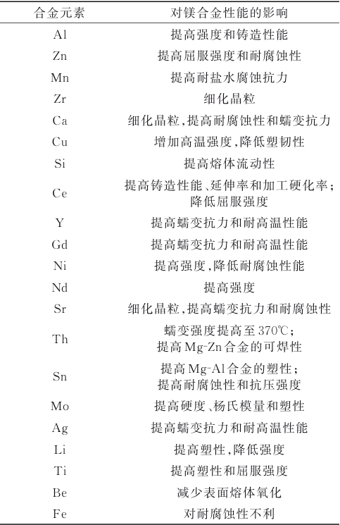 表1 鎂合金中常見合金元素及其對合金的影響