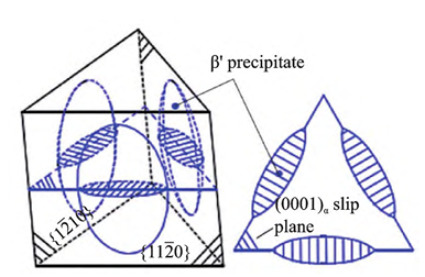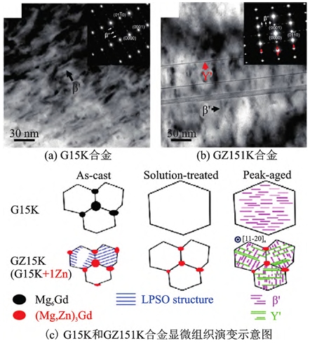 圖8 Mg-Y系合金時效析出強化模型 Mg-Gd系鑄造鎂合金中添加Zn,Y和Nd等合金元素形成三元或多元合金,力學性能更高,抗拉強度甚至可以超過350 MPa。在Mg-Gd系添加Zn 元素時,合金的時效析出序列會發生變化,當合金中 Gd的質量分數在6%以下時,析出序列為:SSSS→ γ??(hcp-Mg70 Gd15 Zn15 )→ γ?(hcp-MgGdZn)→ γ(hcp Mg12 GdZn)。γ?相在 α-Mg基面上形成,可以提高合金的峰時效硬度。而在Gd含量較高的合金中添加Zn時,析出強化來源于在基體棱柱面析出的β? 相與基面析出的γ?相的復合作用,合金力學性能進一步提升。Rong等在Mg-15Gd-0.4Zr合金中添 加1%Zn(質量分數)后,峰時效態合金的屈服強度從232 MPa提高至288 MPa,抗拉強度從296 MPa 提高至403 MPa,這是因為γ?和β?相在基體中相對垂直分布,對基體產生了復合強化作用,其組織形貌如圖9所示。此外,上海交通大學在Mg-Gd合金基礎上開發出高強耐熱鑄造 Mg-10Gd-3Y-0.5Zr (GW103K,JDM2)合金,在低壓鑄造或重力鑄造時有較好的流動性和抗熱裂性,合金經固溶和時效處理后,合金室溫力學性能大大提高,屈服強度高達 240 MPa,延伸率為6%,在300 ℃高溫下屈服強度仍能保持很高水平,對航空航天、軍工等領域輕量化作出極大貢獻,已被應用于輕型導彈殼體及雷達部 件等制備。 Gd 元素在α-Mg中的極限固溶度高于Y,從 548 ℃降溫至200 ℃時,其固溶度從23.5%降至4% (質量分數),因此對Mg-Gd合金進行時效處理,基體可析出大量納米相,帶來顯著的時效硬化效果。Mg-Gd的時效析出序列與Mg-Y系完全相同,峰時效態下主要是β?與β??或β?與β1 兩相共存狀態,合金具有較強的室溫屈服強度。 輕稀土元素Nd在α-Mg中的極限固溶度約為 3.6%(質量分數),也可使鎂合金產生較強的析出強化效果。Mg-Nd 系合金的時效析出序列為:SSSS→β??(DO19-Mg3 Nd)→β?(fcc-Mg3 Nd)→β(bct Mg12 Nd),β??為合金峰時效態下的主要強化相,該相與鎂基體完全共格,二者位向關系為:(0001)β?? // (0001)Mg ,β?? //Mg 。β??相的熱穩定性較高,可以提高Mg-Nd合金的高溫穩定性和耐熱性。然而,Nd元素在Mg中的生長限制因子Q值較小,對鎂合金起不到明顯的細化效果,因此Mg-Nd 合金的鑄態晶粒通常較粗大,無法作為結構材料進行服役,通常需要額外添加Zr或Zn等元素以細化晶粒、改善鑄造性能。上海交通大學在高強耐熱 ZM6合金基礎上調整了Nd/Zn比,開發出性能優良且成本低的Mg-3Nd-0.2Zn-0.4Zr(JDM1)鎂稀土合金,該合金兼具較好的鑄造性能和力學性能,已被應用于汽車輪轂、發動機支架等零部件上。 上述常見的幾類鑄造鎂合金系列及其性能特點整理在表3和表4中。在實際生產中,需要根據鑄件的使用工況來選取合適的合金材料。現有的合金系列均存在一些性能和應用瓶頸,因此優化合金成分, 開發新型合金已成為鑄造鎂合金的重要研究方向 之一。
