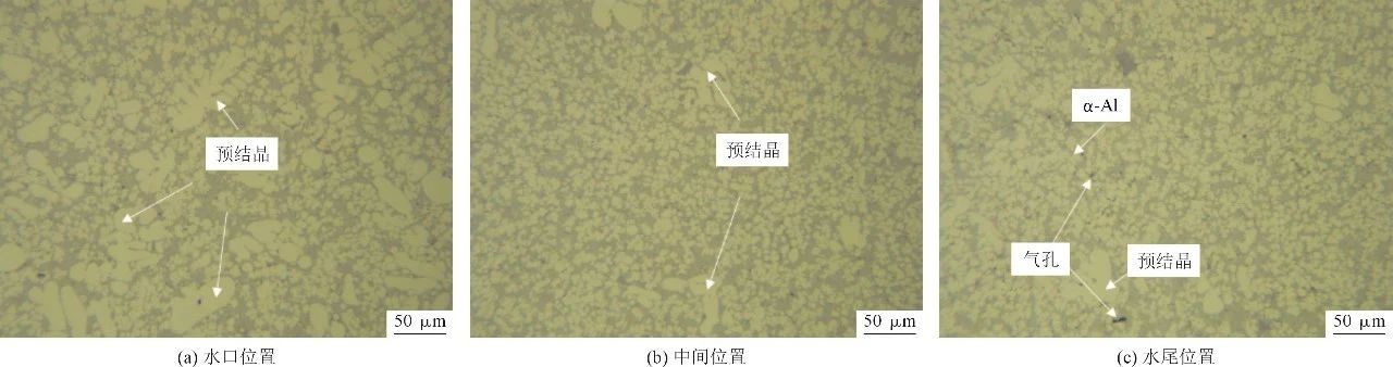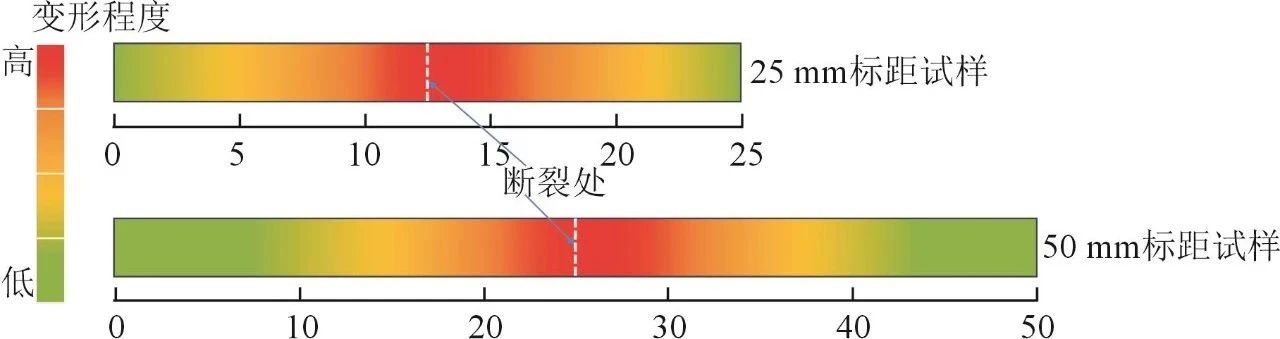 圖7 平板水口、中間、水尾位置金相組織 表2為兩種試棒的力學性能。可以看出,標距的變化對抗拉強度和屈服強度的影響不明顯,但壓鑄試棒的標距越長,伸長率越低。這可以通過材料塑性變形模型解釋,見圖8。因材料在測試過程的拉伸條件并非理想的靜態(tài)拉伸,試棒的塑性變形并非理想的均勻變形,而是斷裂處附近的變形量更大,遠離斷裂點的位置則呈現(xiàn)出相對較小的變形量。特別是在標距(即平行段)較長的試棒中,變形量較小的區(qū)域占比較大,導致整體伸長率的平均值下降。而試棒的強度測試結果只與斷裂時的力與斷口截面積相關,因此標距長短對抗拉強度和屈服強度的影響相對有限。