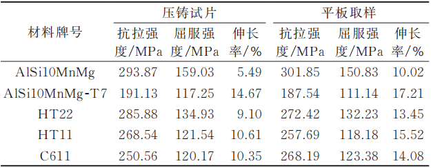 ![]() 隨著一體化壓鑄的興起,越來越多的汽車結構件開始使用壓鑄鋁合金生產,其中最大的挑戰(zhàn)之一便是需要獲得高伸長率,尤其是在高強韌免熱處理材料領域。鋁合金鑄件力學性能的影響因素較多,按工藝順序可以分為3類:①合金成分,通過改變材料相組成、組織形貌、晶粒大小等調整材料性能;②鑄造工藝,包括鑄造方式、模具設計、熔煉、澆注方式、鋁料溫度、凝固和冷卻等多個環(huán)節(jié),通過調整鑄件夾雜、氣孔和裂紋等內部品質影響鑄件性能;③熱處理工藝,不同的固溶、時效溫度、時間以及冷卻方式對鑄件的硬度、強度和韌性等性能有顯著影響。 研究發(fā)現(xiàn),即便是同種材料和相同鑄造工藝,同一產品不同區(qū)域的力學性能也可能存在很大差異。對于性能較差的區(qū)域,難以通過調整鑄造工藝大幅提高其力學性能。對于相同的材料,在不同鑄件上,即便在相同區(qū)域取樣,所測得的力學性能仍有差異。本研究分析影響壓鑄件力學性能的因素,總結高強韌壓鑄鋁合金鑄件本體取樣力學性能與材料理想力學性能之間的差異,聚焦于高真空壓鑄結構件性能測試過程中伸長率的影響,通過深入分析平板模、試棒模以及實際結構件的力學性能,探討了材料成分對免熱處理合金的強韌作用,重點研究了取樣方式和鑄件結構設計對鑄件力學性能的影響。對高強韌鋁合金在測試過程中的試片類型、標距大小等關鍵因素進行分析,提供了獲取材料理想性能的測試方法與建議。此外,系統(tǒng)比較了傳統(tǒng)AlSi10MnMg熱處理材料、高強韌免熱處理材料在鑄件本體取樣與材料理想性能之間的波動偏差。旨在為高強韌免熱處理鋁合金鑄件的力學性能提高及測試方法提供參考。 圖文結果 選用了4種高強韌合金,其設計成分見表1。這些材料被用于壓鑄平板試樣和試棒,其中試棒標距為25 mm和50 mm。利用AlSi10MnMg合金和自主生產免熱處理HT11合金壓鑄生產了一款小型減震塔鑄件。其中AlSi10MnMg合金的T7熱處理過程在輥道式熱處理生產線上進行,具體工藝為:460 ℃×2.5 h固溶處理+風淬處理3.5 min+210 ℃×156 min時效處理。 圖1為試驗材料壓鑄的所用試棒、平板(一模兩腔)、減震塔(一模兩腔)鑄件模型,分別采用4 500、12 500、25 000 kN的壓鑄機生產。試棒除毛刺后可以直接拉伸測試,通過線切割加工制備平板和減震塔鑄件的拉伸試片,其標距為25 mm,尺寸見圖2,平板取樣厚度為3 mm,鑄件取樣試樣厚度取決于鑄件。在拉伸試驗前,試片的側面經過細砂紙打磨,直至表面粗糙度達到Ra≤5 μm。拉伸試驗在CMT5205拉伸試驗機上進行,拉伸速率為1 mm/min。依次使用400、800、1 500、2 000目的砂紙打磨金相試樣,采用SiC懸浮劑進行拋光處理,利用MDS400金相顯微鏡對試樣的微觀結構進行觀察和分析。