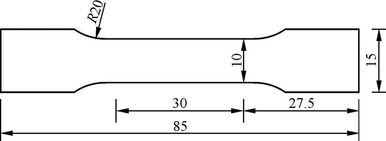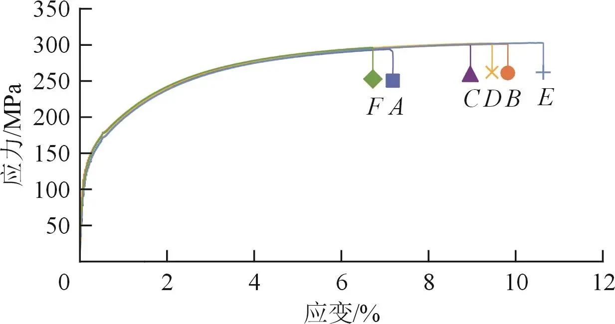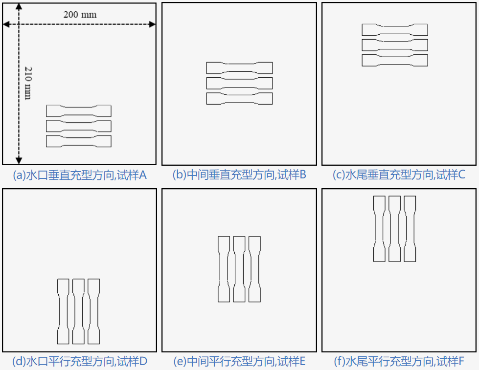 圖2 拉伸試樣尺寸 選用AlSi10MnMg平板,研究取樣方式對其拉伸力學性能的影響。試片分為2組:試片A、B、C垂直于平板主充型方向,試片D、E、F平行于平板主充型方向,取樣位置包括水口附近、平板中間以及水尾。圖3為6組不同取樣方式示意圖,其應力-應變曲線見圖4。圖5為不同取樣方式AlSi10MnMg平板鑄件的平均伸長率。可以看出,取樣方式對試樣強度影響并不明顯。伸長率的變化相較于強度更為顯著。在平行充型方向的中間位置(E組),獲得了最高的伸長率,達到9.42%;而在平行充型方向水尾位置(F組),伸長率則最低,為6.84%。