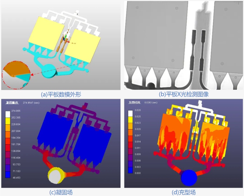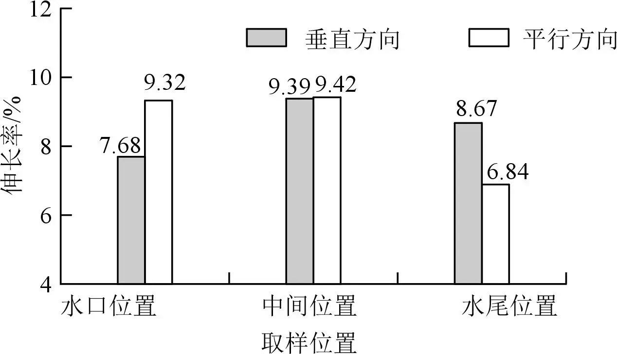 圖5 AlSi10MnMg平板不同位置、方向取樣伸長率 隨著鋁液在型腔內的逐步填充,鋁液溫度會逐漸降低并凝固。鑄件在水口位置因溫度較高且均勻,在無卷氣、熱節(jié)時,內部品質通常優(yōu)于其他位置;溫度越低,越易產生縮孔、冷隔等缺陷,內部品質通常較差,性能更低。然而,從圖5可見,設計的平板并不完全遵循這一規(guī)律。伸長率最佳的位置均出現(xiàn)在平板的中間,而非水口。這一現(xiàn)象與平板設計的特定因素緊密相關。圖6為平板外形、X光檢測和模流分析。從圖6a可以看出,試驗平板的內澆口經過減薄處理,導致鋁液在進入內澆口后能以較大的速度向前填充。盡管平板各處的凝固時間差異不大(見圖6c),鋁液在水口附近的填充順序卻存在先后差異(見圖6d),這使得垂直充型方向的鋁液填充不均勻,從而導致伸長率相對較差。在水尾位置,垂直方向的伸長率反而較高,這表明垂直方向劣于平行方向的規(guī)律并非固定不變。鋁液的凝固過程并不嚴格遵循順序凝固規(guī)律,在型腔內鋁液溫度的不一致性仍會導致先后凝固差異,對鑄件內部質量影響不顯著,見圖6b,但對力學性能,尤其是伸長率的影響頗為明顯。