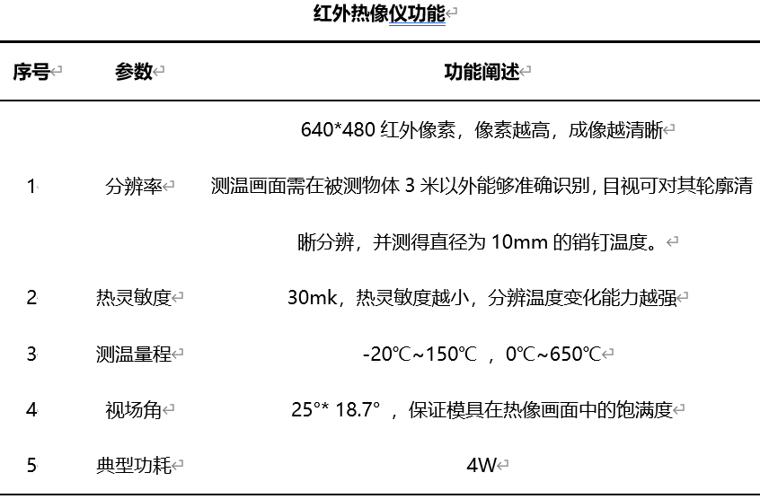 系統(tǒng)由多種關(guān)鍵硬件組成,包括安裝在壓鑄現(xiàn)場(chǎng)的在線紅外熱像儀、熱像儀防護(hù)罩、電源設(shè)備,以及用于現(xiàn)場(chǎng)監(jiān)控的工控機(jī)或PC。其中,在線紅外熱像儀作為核心組件,能夠?qū)崟r(shí)采集模具表面的溫度分布數(shù)據(jù),生成高分辨率的熱像圖,為模溫分析提供直觀的參考。熱像儀防護(hù)罩為設(shè)備提供必要的物理保護(hù),確保其在高溫、高壓、潮濕等復(fù)雜工作環(huán)境中的穩(wěn)定運(yùn)行。電源設(shè)備則為系統(tǒng)持續(xù)運(yùn)行提供穩(wěn)定的能源支持,而工控機(jī)或PC作為數(shù)據(jù)處理與監(jiān)控中心,負(fù)責(zé)實(shí)時(shí)接收、存儲(chǔ)并分析熱像儀采集的溫度數(shù)據(jù),協(xié)助操作人員動(dòng)態(tài)監(jiān)測(cè)和優(yōu)化模具溫度控制。通過(guò)各硬件的緊密配合,系統(tǒng)能夠在不中斷生產(chǎn)的情況下,實(shí)現(xiàn)對(duì)模具溫度的實(shí)時(shí)、精準(zhǔn)監(jiān)測(cè),為壓鑄工藝提供高效、可靠的溫度管理支持。接下來(lái)將對(duì)各組件進(jìn)行詳細(xì)說(shuō)明。 系統(tǒng)核心設(shè)備為高性能紅外熱像儀,集成了進(jìn)口處理芯片、法國(guó)紅外熱成像芯片以及賽靈思FPGA邏輯芯片,這些高端硬件的組合確保了設(shè)備卓越的計(jì)算性能與穩(wěn)定性。紅外熱像儀的分辨率為640×480紅外像素,相較于傳統(tǒng)設(shè)備,其像素密度更高,能夠呈現(xiàn)更清晰的溫度分布圖,精確捕捉模具表面的溫度變化,滿足高精度測(cè)量需求。設(shè)備在3米以外即可準(zhǔn)確識(shí)別被測(cè)物體的溫度分布,確保即使在生產(chǎn)現(xiàn)場(chǎng)復(fù)雜環(huán)境中,也能保持較高的溫度測(cè)量可靠性和成像質(zhì)量。此外,目視條件下,紅外熱像儀能夠清晰分辨模具輪廓,且精確測(cè)量直徑為10mm的銷釘溫度,為精細(xì)部件的熱分布分析提供支持。該紅外熱像儀還具有卓越的穩(wěn)定性,支持7*24小時(shí)不間斷運(yùn)行,即使在高溫、高濕或震動(dòng)等嚴(yán)苛的工業(yè)環(huán)境下,依然能夠持續(xù)提供可靠的溫度數(shù)據(jù)。這種設(shè)計(jì)有效避免了傳統(tǒng)測(cè)溫設(shè)備因間歇性停機(jī)或誤差帶來(lái)的生產(chǎn)效率下降問題,特別適合高強(qiáng)度的壓鑄生產(chǎn)環(huán)境。具體的設(shè)備參數(shù)如表1所示:
