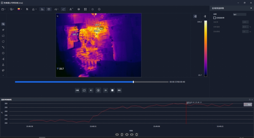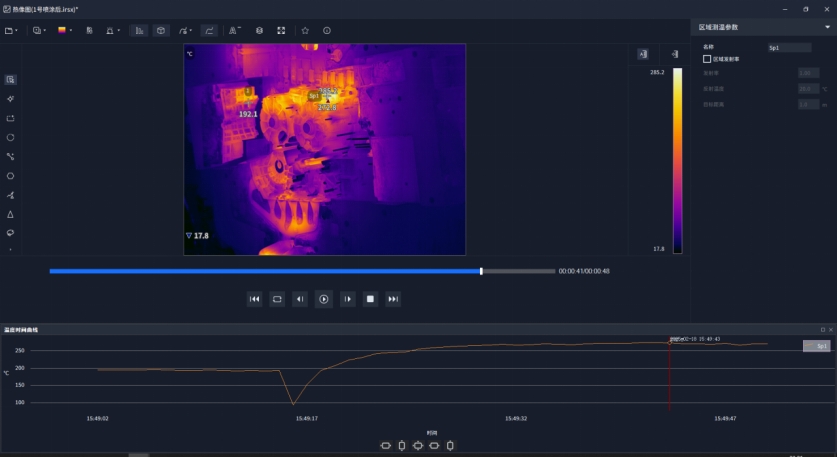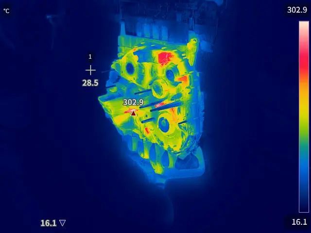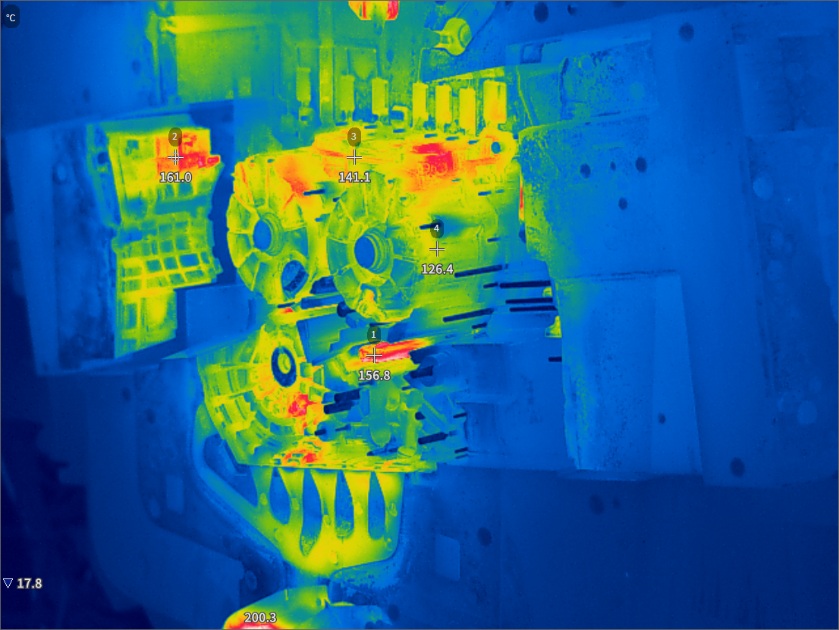 圖4 針對(duì)熱成像圖像中反映出的冷卻不均問題,生產(chǎn)團(tuán)隊(duì)對(duì)模具冷卻系統(tǒng)進(jìn)行了整改。通過(guò)調(diào)整銷釘部位的冷卻通道布局,增加了冷卻液的流量,并重新優(yōu)化了冷卻液的溫控策略,以確保銷釘區(qū)域能夠得到充分的冷卻。整改后,再次使用熱成像儀對(duì)同一部位進(jìn)行監(jiān)測(cè),結(jié)果顯示銷釘區(qū)域的溫度降幅符合預(yù)期,成功降至了150℃左右。這一變化證明了冷卻系統(tǒng)的調(diào)整有效提升了該部位的冷卻效率。 經(jīng)過(guò)整改后的冷卻系統(tǒng)不僅解決了銷釘部位溫度過(guò)高的問題,還有效避免了因過(guò)高溫度導(dǎo)致的零部件開裂。通過(guò)后續(xù)的生產(chǎn)驗(yàn)證,使用熱成像技術(shù)監(jiān)測(cè)后的模具冷卻過(guò)程更加均勻,零部件的質(zhì)量得到顯著改善。最終,本次實(shí)驗(yàn)驗(yàn)證了熱成像技術(shù)在發(fā)現(xiàn)冷卻系統(tǒng)問題、提升生產(chǎn)質(zhì)量中的重要作用,并為未來(lái)類似問題的解決提供了有效的技術(shù)手段。具體實(shí)驗(yàn)結(jié)果如圖5所示