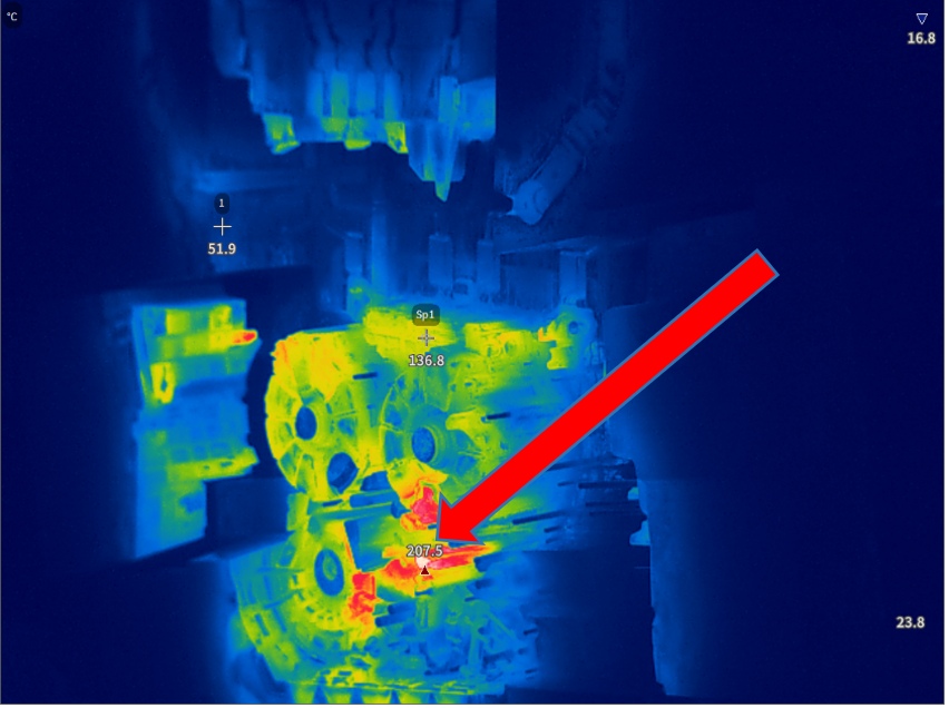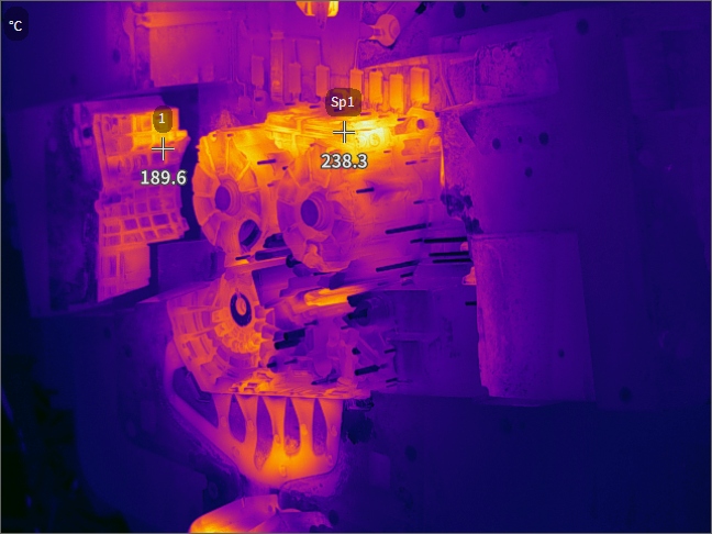 表3 模溫控制系統(tǒng)以高精度、高一致性和廣泛測(cè)溫范圍為核心技術(shù)特點(diǎn),其性能上限充分體現(xiàn)了系統(tǒng)在復(fù)雜工業(yè)環(huán)境中的卓越適應(yīng)能力和可靠性。以下關(guān)鍵參數(shù)具體描述了系統(tǒng)的技術(shù)性能和應(yīng)用價(jià)值: 1、全量程測(cè)溫精度:系統(tǒng)實(shí)現(xiàn)了±2℃或±2%的測(cè)溫精度,能夠滿足壓鑄過(guò)程中對(duì)模具表面溫度監(jiān)測(cè)的嚴(yán)苛要求。精確的測(cè)溫?cái)?shù)據(jù)不僅有助于識(shí)別溫度異常點(diǎn),還為模溫調(diào)節(jié)提供了可靠依據(jù),有效避免因溫差波動(dòng)引發(fā)的鑄件缺陷,如縮痕、裂紋和氣泡等; 2、測(cè)溫一致性:系統(tǒng)的測(cè)溫一致性高達(dá)±1℃或±1%,能夠確保不同時(shí)間和空間點(diǎn)的溫度數(shù)據(jù)始終保持高度一致。這種特性在壓鑄生產(chǎn)的連續(xù)性過(guò)程中尤為重要,能夠提供穩(wěn)定的熱分布監(jiān)測(cè),為精準(zhǔn)調(diào)控工藝參數(shù)提供支撐; 3、環(huán)境溫度適應(yīng)性:系統(tǒng)能夠在-30℃至100℃的環(huán)境溫度范圍內(nèi)穩(wěn)定運(yùn)行,適應(yīng)壓鑄現(xiàn)場(chǎng)的極端工作環(huán)境。這種環(huán)境適應(yīng)能力確保了系統(tǒng)在嚴(yán)苛條件下仍能提供可靠的測(cè)溫結(jié)果,為長(zhǎng)期工業(yè)應(yīng)用奠定了堅(jiān)實(shí)基礎(chǔ); 4、測(cè)溫范圍:系統(tǒng)的測(cè)溫范圍覆蓋了-20℃至650℃,全面滿足了模具從低溫預(yù)熱到高溫壓鑄的全過(guò)程需求。廣泛的測(cè)溫范圍使系統(tǒng)適合于多種不同工藝要求,具有更高的通用性和靈活性; 5、紅外像素分辨率:系統(tǒng)配備了640×480像素的紅外熱像儀,以其高分辨率實(shí)現(xiàn)清晰的熱成像效果。成像細(xì)節(jié)豐富,能夠直觀展現(xiàn)模具表面的熱分布狀態(tài),為工程師提供精準(zhǔn)的視覺分析工具。此外,高像素分辨率確保了測(cè)溫的點(diǎn)密度和分辨率,能夠準(zhǔn)確測(cè)量直徑為10mm的小目標(biāo)區(qū)域溫度。 通過(guò)上述關(guān)鍵參數(shù),系統(tǒng)展示了其在壓鑄工藝中的卓越性能,具備實(shí)時(shí)、高效、精準(zhǔn)的模具溫度監(jiān)測(cè)能力。這些技術(shù)性能不僅有助于改善鑄件質(zhì)量,還顯著提高了生產(chǎn)效率,降低了資源浪費(fèi)和維護(hù)成本,為現(xiàn)代化壓鑄生產(chǎn)提供了強(qiáng)有力的技術(shù)支持。 3實(shí)驗(yàn)驗(yàn)證 3.1 實(shí)驗(yàn)設(shè)計(jì) 在壓鑄生產(chǎn)過(guò)程中,模具溫度的控制至關(guān)重要,尤其是在噴涂后冷卻階段。通常,噴涂后的模具溫度應(yīng)迅速降低至150℃左右,以確保良好的鑄件質(zhì)量,并避免由于過(guò)高的溫度導(dǎo)致零部件局部的應(yīng)力集中和裂紋生成。然而,在某一生產(chǎn)批次中,銷釘部位的溫度冷卻后仍然保持在216℃,遠(yuǎn)高于理想溫度,進(jìn)而導(dǎo)致生產(chǎn)出的零部件在該部位經(jīng)常發(fā)生開裂現(xiàn)象。由于在之前的生產(chǎn)過(guò)程中未使用熱成像技術(shù),生產(chǎn)團(tuán)隊(duì)未能及時(shí)發(fā)現(xiàn)冷卻系統(tǒng)的問題,只有在零部件質(zhì)量異常的情況下,才意識(shí)到該部位可能存在溫度控制問題。如圖1所示